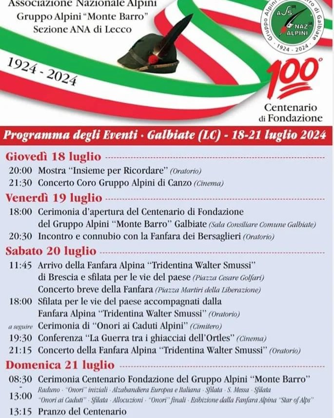 Le celebrazioni inizieranno giovedì 18 luglio con la mostra “Insieme per Ricordare” e il concerto del Coro Gruppo Alpini di Canzo. Venerdì 19 luglio sarà la giornata della cerimonia di apertura del Centenario, che vedrà la partecipazione della Fanfara Guglielmo Colombo di Lecco. Sabato 20 luglio, ci sarà l’arrivo della Fanfara Alpina “Tridentina Walter Smussi” di Brescia che darà il via a una sfilata per le vie del paese, seguita da un concerto. La giornata culminerà con la cerimonia degli “Onori ai Caduti Alpini” e un altro concerto della Fanfara. Domenica 21 luglio sarà il clou delle celebrazioni, con la Cerimonia del Centenario di Fondazione e un pranzo comunitario con cui si chiuderanno i festeggiamenti.