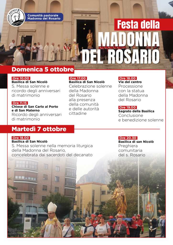 Martedì 7 ottobre si celebrerà la memoria liturgica della Beata Vergine del Rosario, con la santa Messa delle 18:30 in basilica, alla presenza dei sacerdoti della comunità, i sacerdoti nativi o quelli che hanno svolto qui il loro ministero. Alle 20:00, tutti i fedeli sono invitati alla recita del Santo Rosario presieduta dal prevosto don Bortolo Uberti. In questa giornata saranno sospese le messe vespertine in Santuario e a San Materno.
