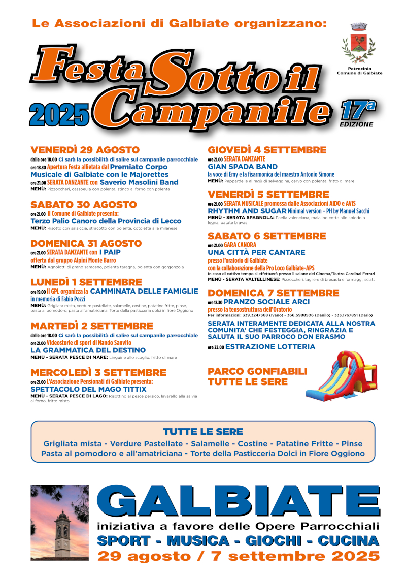 GALBIATE – Musica, cultura, sport, spettacoli e… buona cucina. È questa la formula vincente della “Festa sotto il campanile”, giunta alla sua 17^ edizione, organizzata dalle associazioni galbiatesi con il patrocinio dell’amministrazione comunale galbiatese e il cui ricavato andrà come sempre a favore delle opere parrocchiali.