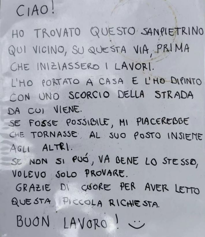Il cittadino, infatti, dopo aver dipinto il cubetto in porfido con uno scorcio di Laorca visibile dalla strada stessa, l’ha riportato sul lungo del cantiere con un messaggio che esprimeva il desiderio di poterlo ricollocare lungo la via. Ora a Laorca c’è una nuova piccola opera d’arte…