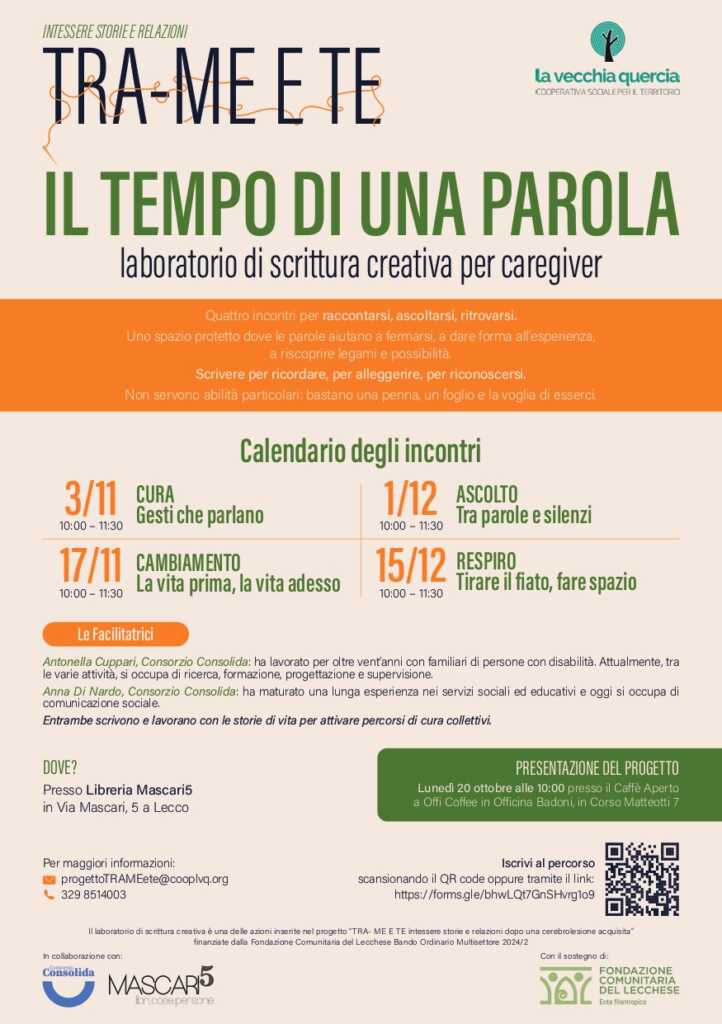 Durante l’incontro verrà presentato anche “Il tempo di una parola”, un laboratorio di scrittura creativa dedicato ai caregiver familiari di persone con disabilità acquisite. Quattro incontri, 3 e 17 novembre, 1 e 15 dicembre, dalle 10.00 alle 11.39, presso la Libreria Mascari5 di Lecco. I partecipanti, guidati da Antonella Cuppari e Anna Di Nardo (Consorzio Consolida), potranno riscoprire, attraverso la scrittura, uno spazio protetto di ascolto, riflessione e condivisione. Le iscrizioni sono aperte online: forms.gle/bhwLQt7GnSHvrg1o9