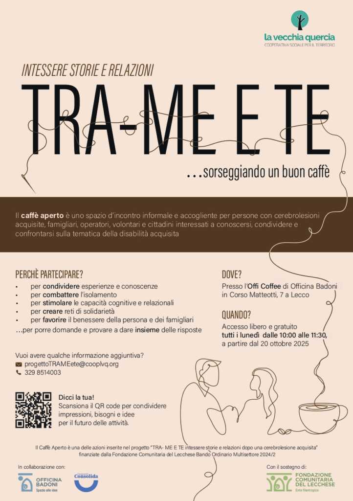 Gli appuntamenti si terranno presso l’Offi Coffee di Officina Badoni, nell’ambito del progetto “TRA-ME e TE: intessere storie e relazioni dopo una cerebrolesione acquisita”, promosso dalla Cooperativa Sociale La Vecchia Quercia in collaborazione con Consorzio Consolida e finanziato da Fondazione Comunitaria del Lecchese attraverso il Bando Ordinario Multisettore 2024/2.