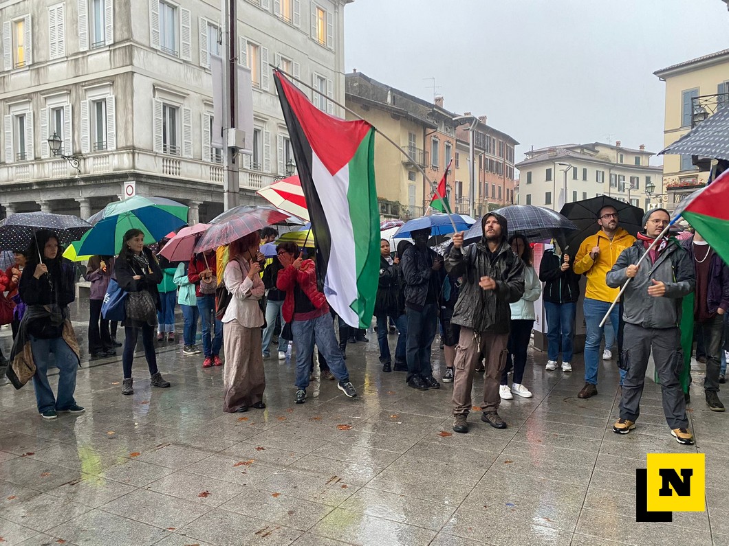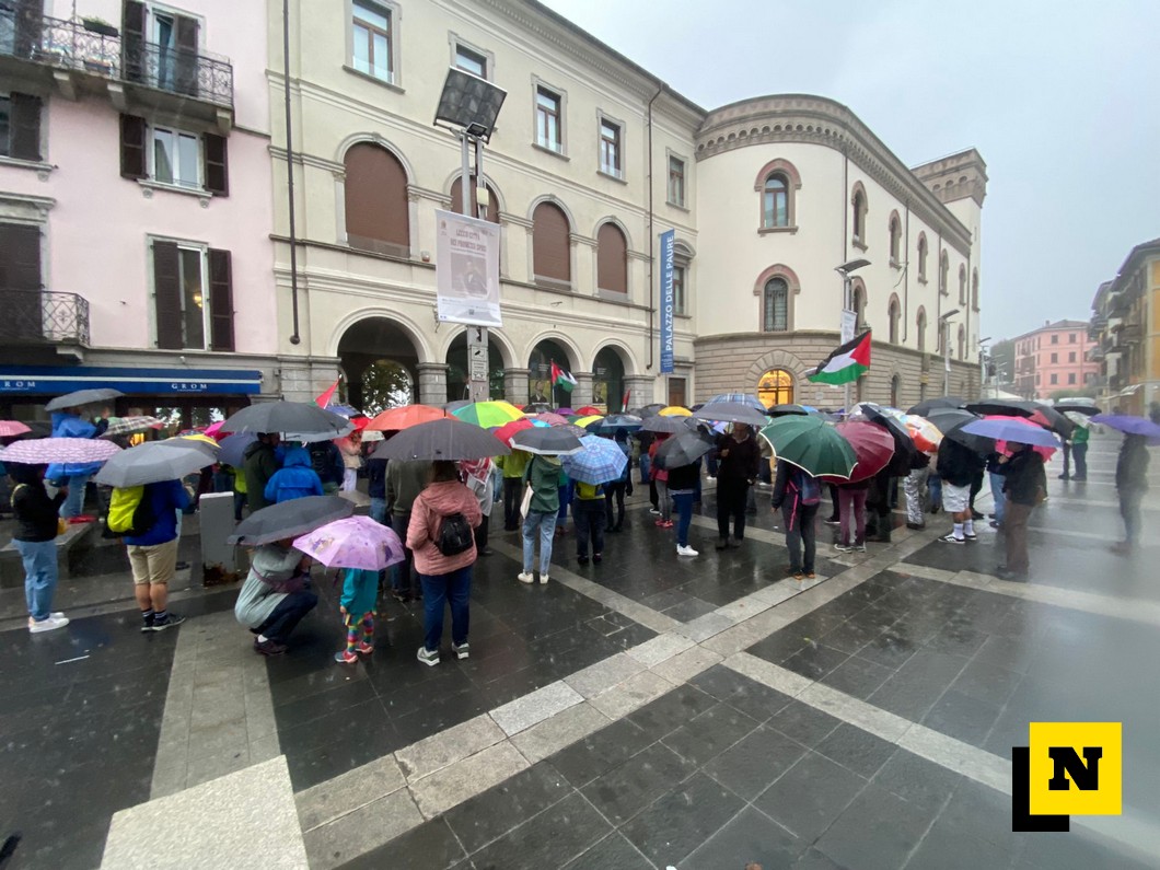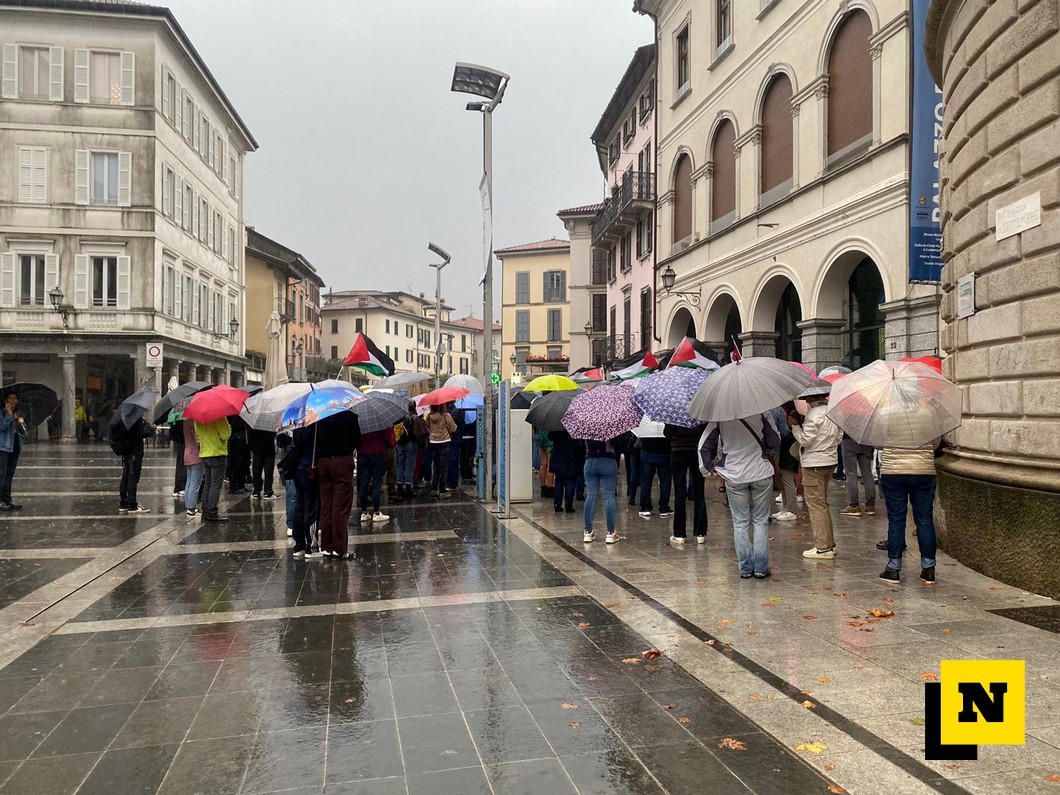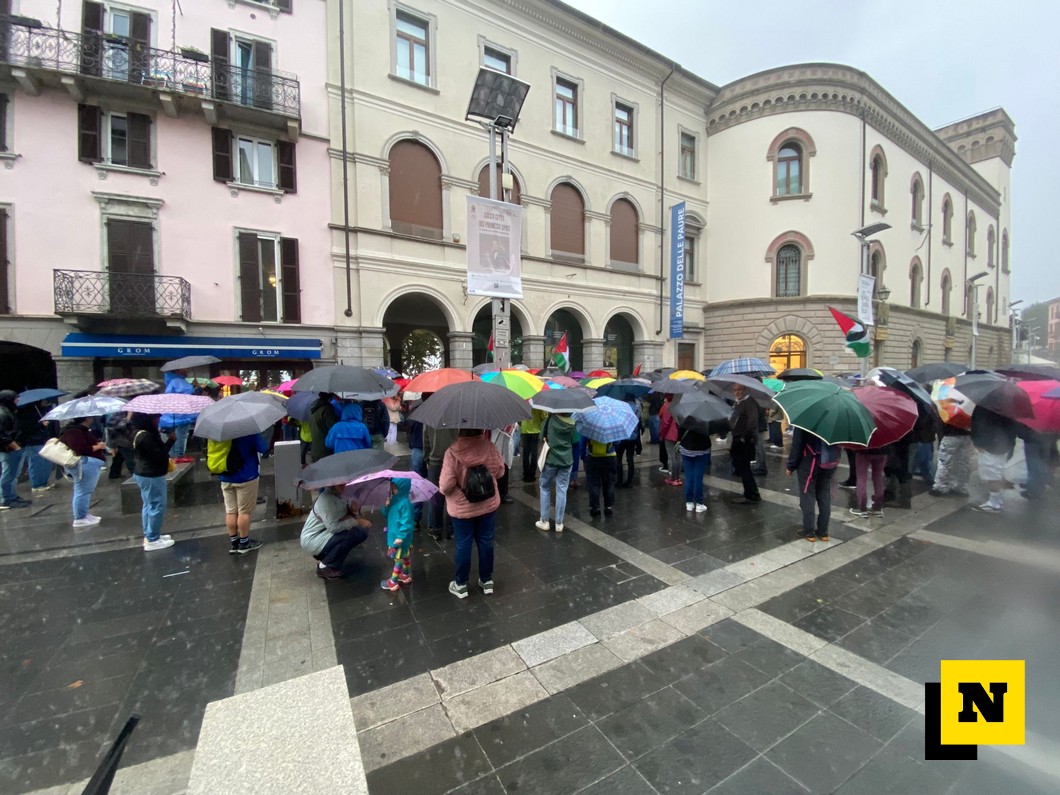 Anche a Lecco, sotto il diluvio, il presidio per la Palestina