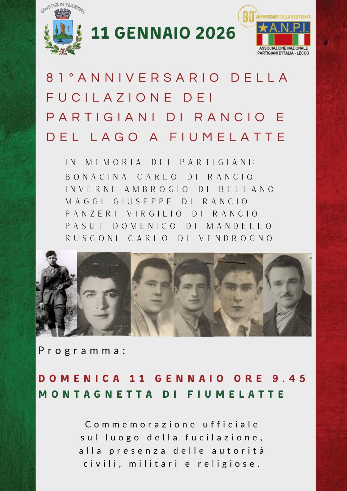 Nell’81° anniversario delle fucilazione dei partigiani di Rancio e del Lago si terrà una commemorazione domenica 11 gennaio alle ore 9.45 alla Montagnetta di Fiumelatte.
