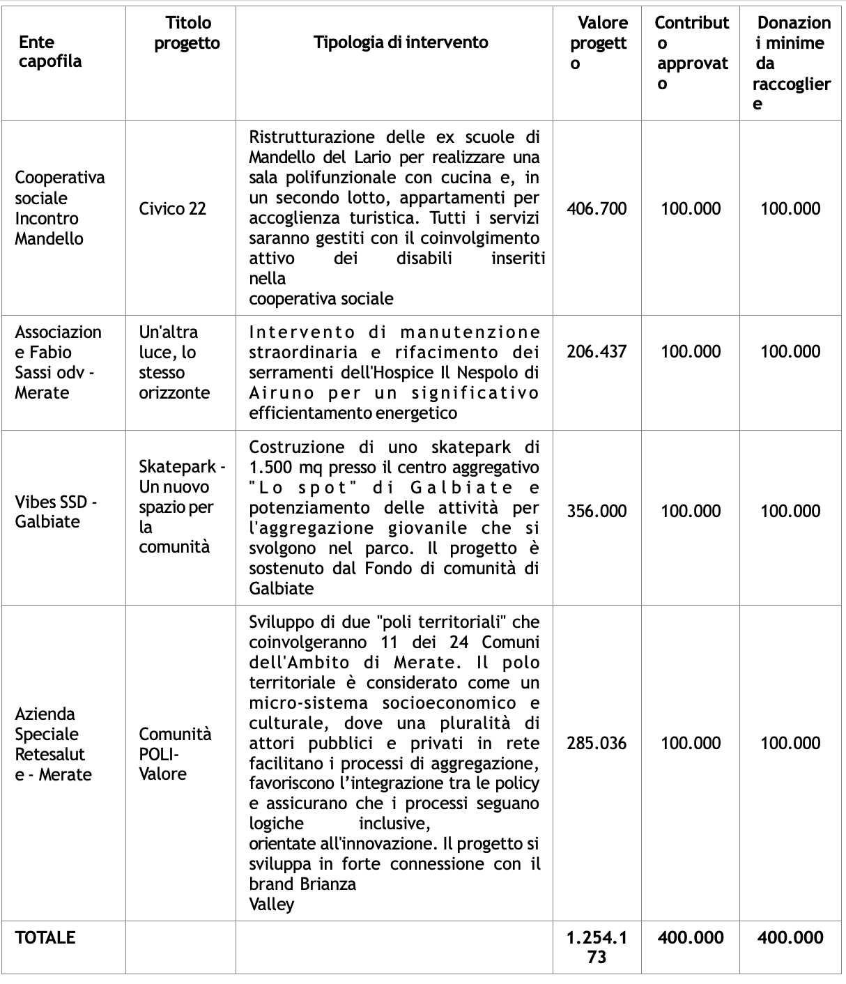 “Il vincolo di raccogliere donazioni rappresenta un criterio consolidato per la Fondazione comunitaria, ma in questo Bando assume un rilievo particolarmente impegnativo, viste le dimensioni dei contributi erogati. La Fondazione esprime pertanto la propria soddisfazione per la significativa adesione degli enti del territorio, che conferma ancora una volta la maturità della nostra comunità locale” spiegano dalla Fondazione comunitaria del Lecchese.