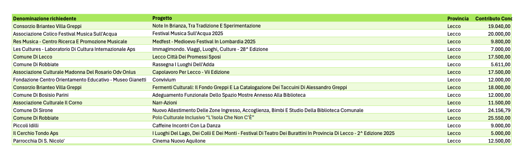 LECCO – Regione Lombardia ha approvato la graduatoria relativa all’Avviso unico 2025 che finanzia interventi nelle seguenti aree: promozione educativa e culturale; musei, archivi, biblioteche e catalogazione; promozione dello spettacolo dal vivo e del cinema.