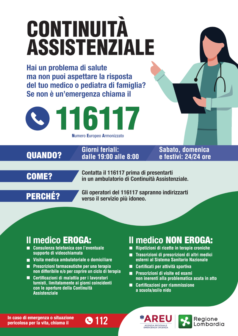 LECCO – A partire da mercoledì 23 luglio, sarà attivata una Centrale UNICA di Continuità Assistenziale, operativa tutti i giorni dalle 19 alle 08 e attiva 24 ore su 24 nei giorni festivi e prefestivi. L’attivazione della Centrale UNICA avviene chiamando il Numero Europeo Armonizzato (NEA) 116117.