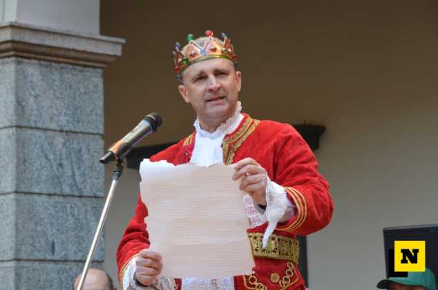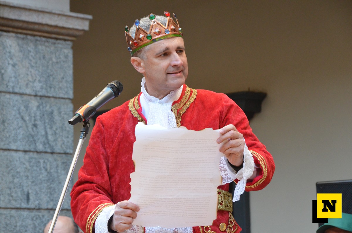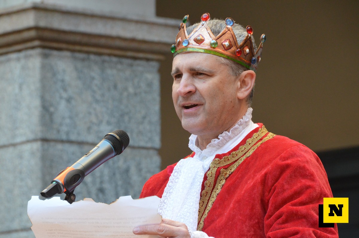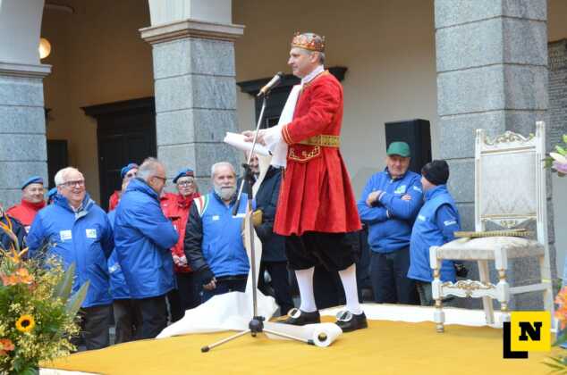Il sindaco ha poi augurato a tutti una bella settimana di festa prima di consegnare ufficialmente le chiavi di Lecco a Re Resegone e Regina Grigna. Quindi, come vuole la tradizione, è toccato al re fare il proprio discorso: “Grazie per questa importante investitura che ci riempie di orgoglio e di gioia. Io e la mia consorte abbiamo deciso di emanare un editto perché il respiro della Breva e del Tivano, che caratterizza la nostra città, col suo spirito di gioia e felicità dovrà pervadere le strade del regno per tutta la settimana. Soffio che dovrà portare a ciascun lecchese leggerezza e divertimento sano, rispettoso ed educato. Ciascun lecchese dovrà coinvolgere con questo animo chiunque incontri e il Gran Ciambellano controllerà che tutti si divertano. E’ un grande onore ricevere le chiavi della città perché sono simbolo di custodia della ricchezza e delle bellezze della città e le useremo per aprire le porte della città a chiunque voglia partecipare a questa antica festa. E poi, ecco il secondo editto: vi ordiniamo di indossare le vostre bellissime maschere e di riempire le strade di Lecco con i coriandoli colorati, coriandoli che poi il Gran Ciambellano dovrà raccogliere uno a uno. Diamo ufficialmente inizio alla settimana del Carnevalone di Lecco: buon divertimento e buone risate a tutti”.