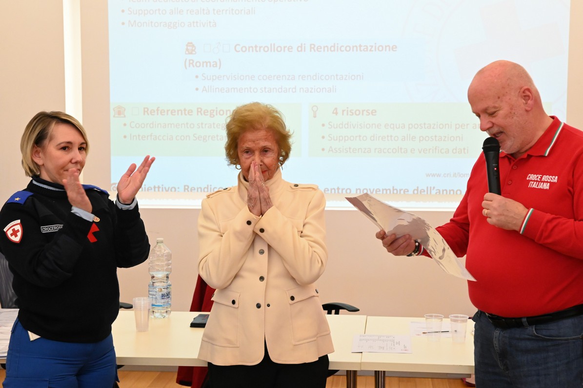 La sorpresa è stata parte integrante della cerimonia. Giovanna, visibilmente emozionata, era stata convinta a partecipare ai lavori dell’assemblea dall’amica Gabriella Salvioni, già figura di rilievo in CRI, la quale le aveva chiesto di accompagnarla al ritiro di una presunta onorificenza. Solo nel momento in cui è stata chiamata, Giovanna ha compreso che il riconoscimento era destinato proprio a lei.