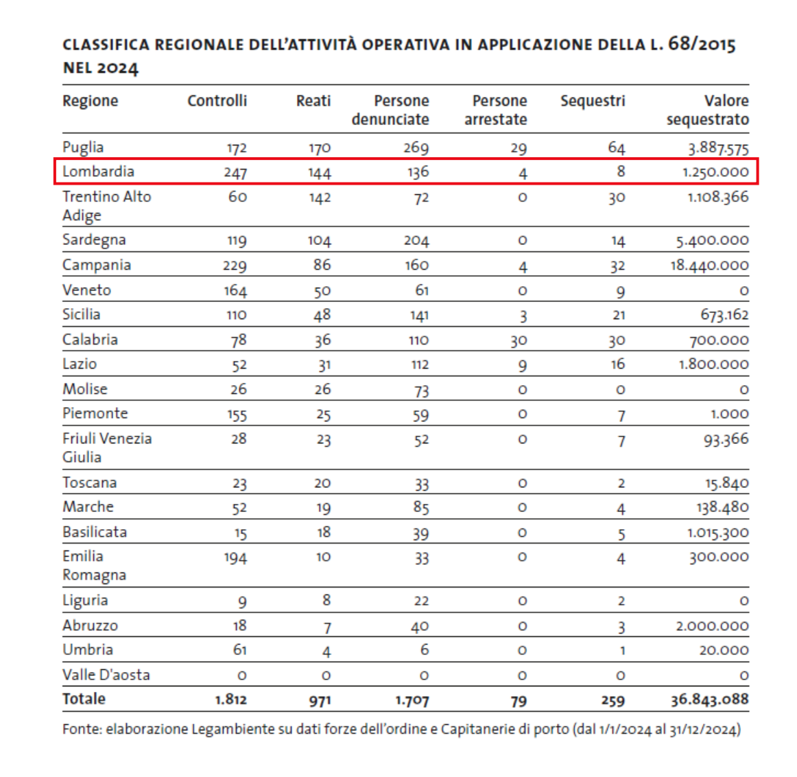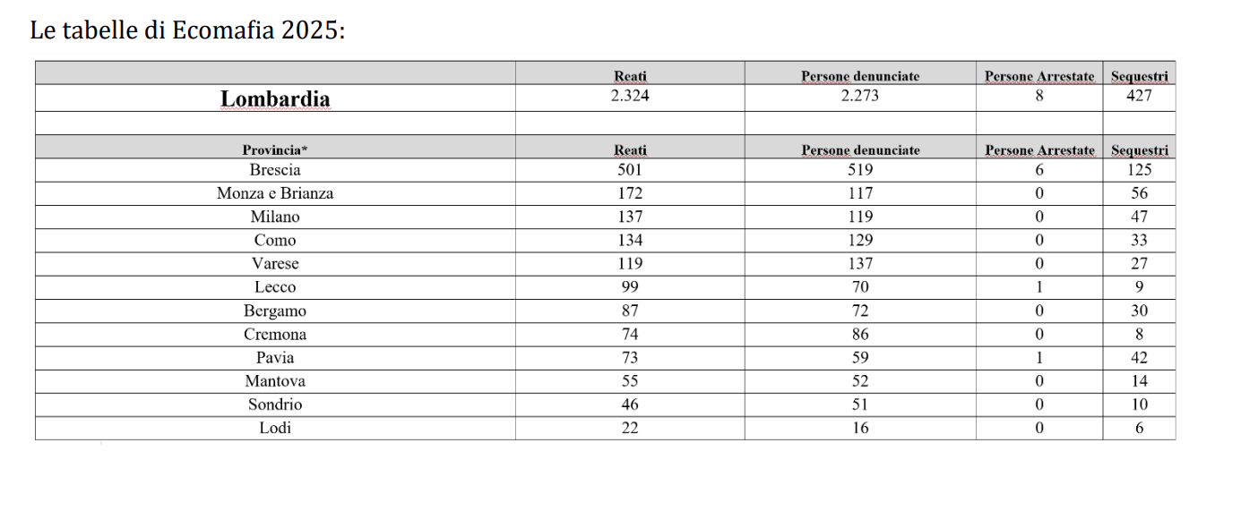 LECCO/MILANO – Come ogni anno, la Lombardia si conferma come una delle regioni dove si consumano le attività illegali con il maggior impatto sul territorio, nelle comunita e negli ecosistemi. Questo l’esito del rapporto Ecomafie 2025 presentato ieri a Roma.