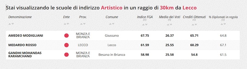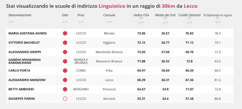 Al terzo posto il Liceo G.B. Grassi di Lecco con un indice FGA di 80,36/100, seguito dal Liceo Rota di Calolziocorte (indice FGA) 78,48/100.