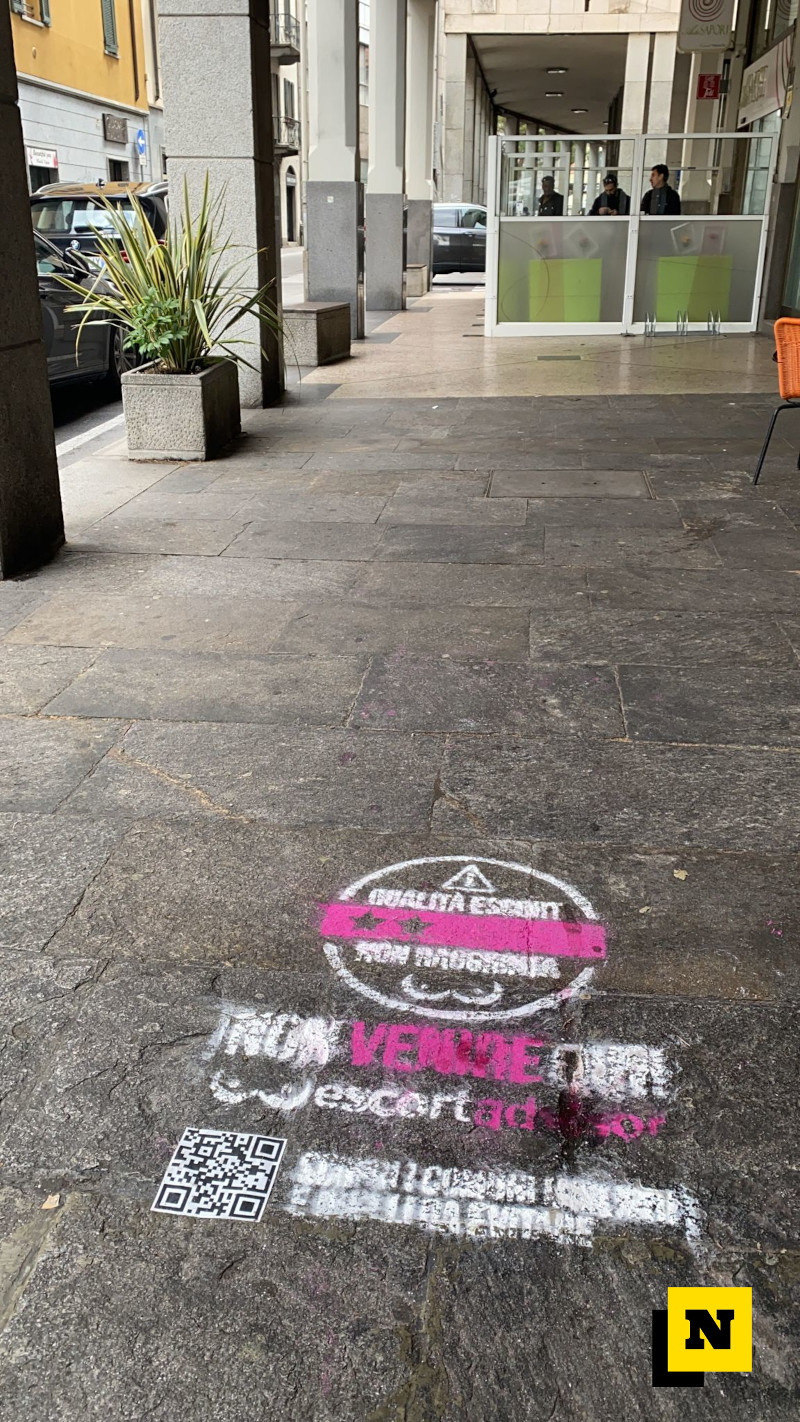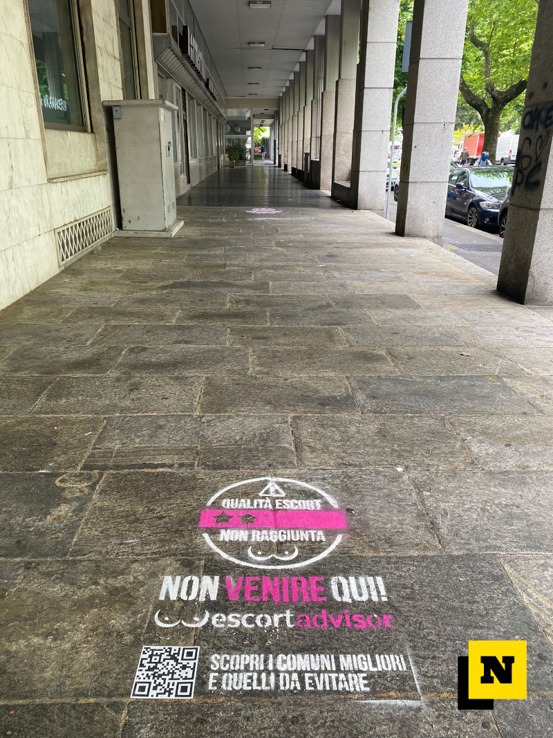Con una sorta di azione di Guerrilla Marketing, sul selciato del grande porticato sono comparsi dei grandi loghi dipinti, con il nome del portale, le due stelle e il giudizio: “Non venire qui”.