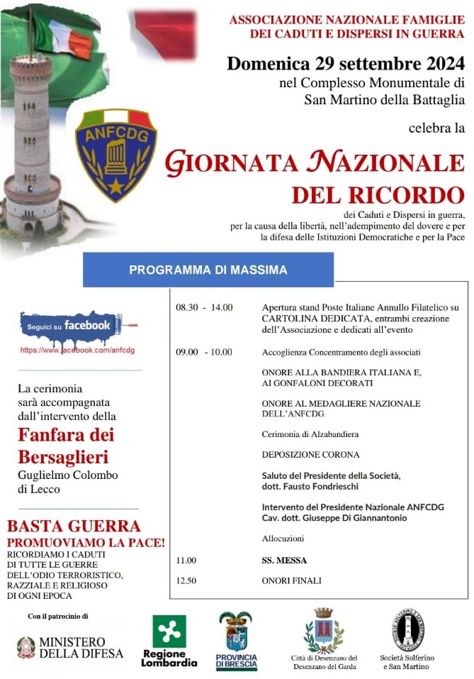 LECCO/DESENZANO DEL GARDA (BS) – L’Associazione Nazionale Famiglie dei Caduti e Dispersi in Guerra si è data appuntamento domani – domenica 29 settembre – ai piedi del complesso monumentale di San Martino della Battaglia, a Desenzano del Garda, per la celebrazione della Giornata Nazionale del Ricordo, in concomitanza con il 165esimo anniversario della battaglia di Solferino e San Martino.