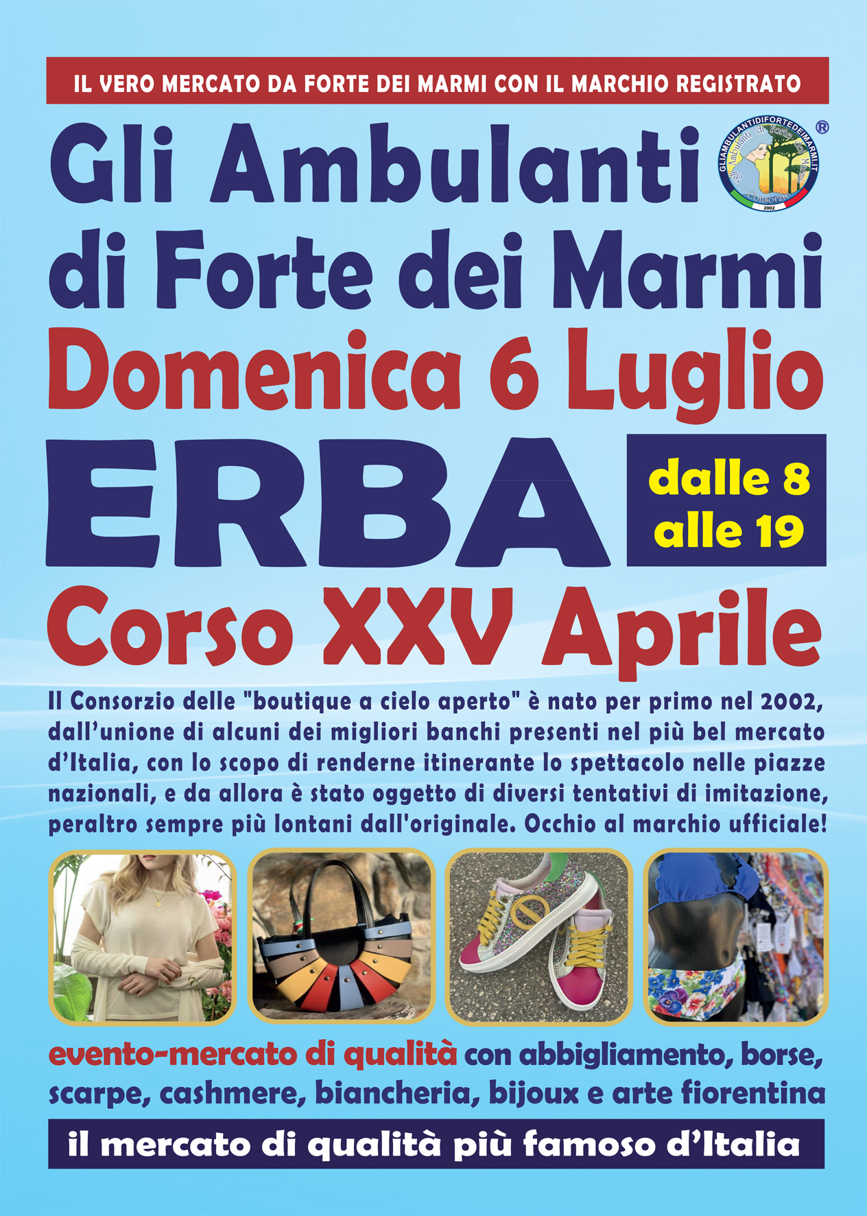 Gli Ambulanti di Forte dei Marmi®, le bancarelle del mercato di qualità più famoso d’Italia, tornano per l’estate a grandissima richiesta nel Comasco con il loro show itinerante all’insegna del meglio del Made in Italy artigianale e delle ultime tendenze della moda. Si potranno infatti ammirare le ormai mitiche boutique a cielo aperto® dell’originale Consorzio domenica 6 luglio a ERBA, in Corso XXV Aprile. Dunque, un’occasione da non perdere assolutamente per i tanti appassionati del genere, che l’hanno a lungo reclamata: una rassegna dello shopping più glamour e conveniente, con orario continuato, anche in caso di maltempo, dalle 8 alle 19.