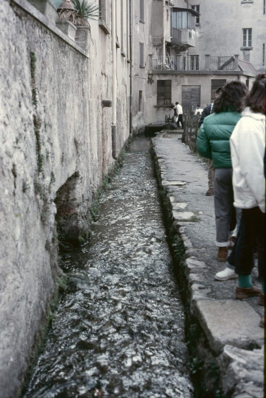 “Un semplice giro di sguardo, senza bisogno di sollecitare la cervicale, basta per abbracciare in un sol colpo la citata roggia della fiumicella che ricalca l’antichissimo tracciato documentato già negli Statuti trecenteschi; la bella chiusa di scarico che, quando passava l’acqua, dava vita a una fragorosa e allegra cascata; il fabbricato sorto negli anni Venti al posto della vecchia “fucina grossa” della Castagna su progetto dell’ingegnere Bernardo Sironi (la cui facciata verso fiume è stata però discutibilmente manomessa); gli edifici appartenuti da fine Settecento alla famiglia Badoni che vi installarono impianti da filatoio, quand’ancora – prima della Restaurazione – si erano declinati verso il settore serico, prima ancora di quello metallurgico; il complesso già vellutificio Redaelli, dove dal 1892 per la prima volta in Italia furono introdotti i telai per la produzione del velluto “in doppia pezza”; il muraglione di sostegno del piazzale annesso a una delle più antiche cartiere lecchesi avviate fin da metà Settecento dalla famiglia Cima. E ancora, sorpassato lo snello ponticello, questo “catalogo a cielo aperto” della storia industriale della vallata si completa con il vasto stabilimento Carera, che ingloba fabbricati di fondazione secentesca (con anche una rarissima e ben conservata ruota idraulica in legno), e il maglietto affacciato su via Mazzucconi dove nel primo Ottocento avviarono la loro fortunata intrapresa metallurgica i Cima ‘del ferro'”.