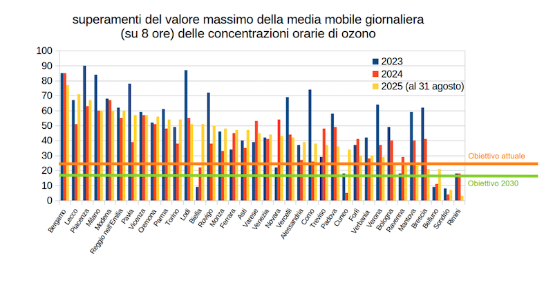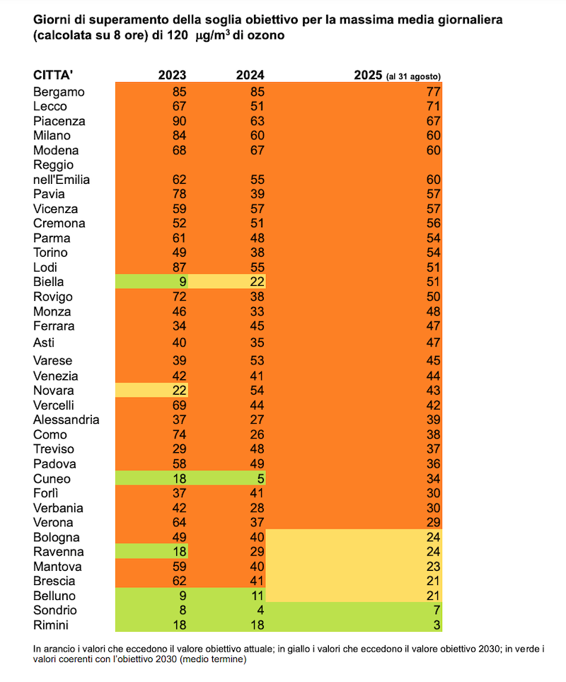 Secondo i dati raccolti da Legambiente Lombardia, Lecco ha registrato 71 giornate di superamento del valore obiettivo per la massima media giornaliera di ozono (120 μg/m³), ben oltre i 25 giorni massimi consentiti dalla normativa europea attuale. Il dato è in peggioramento rispetto al 2024 (51 giorni) e al 2023 (67 giorni). 49 episodi di superamento della soglia di informazione (180 μg/m³ come media oraria), che impongono alle autorità di avvisare la popolazione sui rischi per la salute.