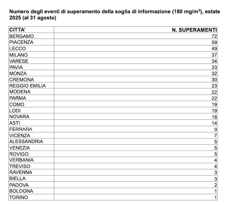MILANO/LECCO – L’estate 2025 si è confermata critica per la qualità dell’aria in Pianura Padana, anche a Lecco, dove l’inquinamento da ozono ha raggiunto livelli preoccupanti.