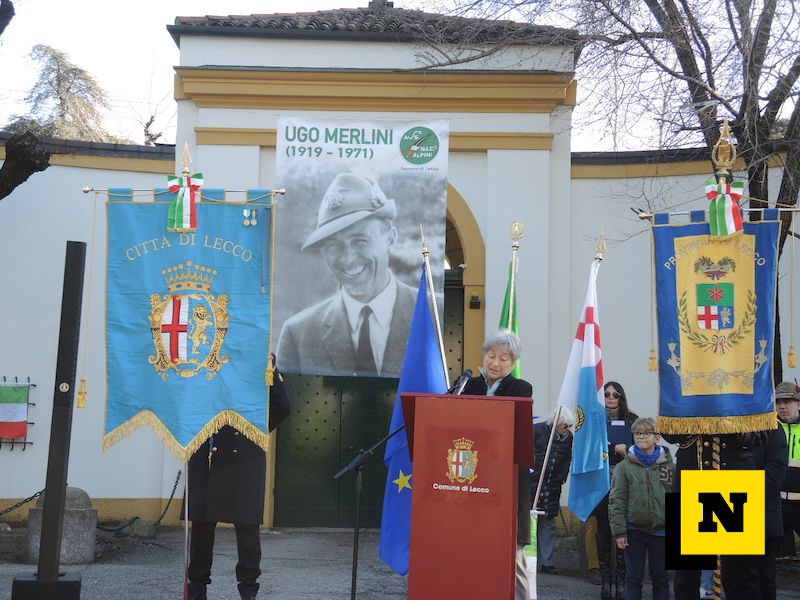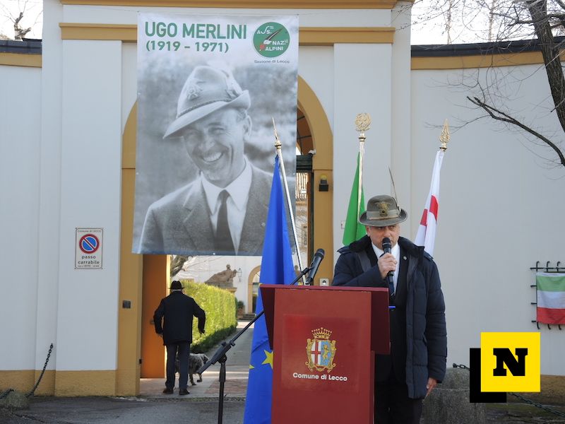 “Lecco vi accoglie nella sua veste migliore, il cielo blu, la neve sulle nostre montagne. Oggi si porta a compimento un percorso iniziato anni fa dall’allora presidente degli Alpini di Lecco Marco Magni e dal sindaco Virginio Brivio, che io e Emiliano Invernizzi abbiamo concluso, condividendo la necessità storica, ma anche etica, di tributare a Merlini uno spazio della nostra città – ha detto il sindaco Mauro Gattinoni – ma questo momento vuole essere anche di riflesso un tributo di gratitudine che rivolgiamo a tutte le nostre Penne Nere, per la disponibilità incondizionata ad esserci e operare quando le circostanze lo richiedono: dalle emergenze di Protezione Civile alla cura del territorio, alla simpatia, bellezza, amicizia e allegria che contraddistinguono le relazioni schiette tra di noi. La famiglia alpina è la più grande associazione d’Italia ed è per noi un orgoglio ricordare Ugo Merlini”. Il sindaco ha continuato: “Questa intitolazione ci indicherà una via, quella dell’unità, della generosità, di un impegno che nasce dalla memoria storica collettiva, di una ripresa coraggioa in grado di sognare in grande. Oggi la nostra città è in festa e grata a Ugo Merlini e a voi tutti Alpini”.