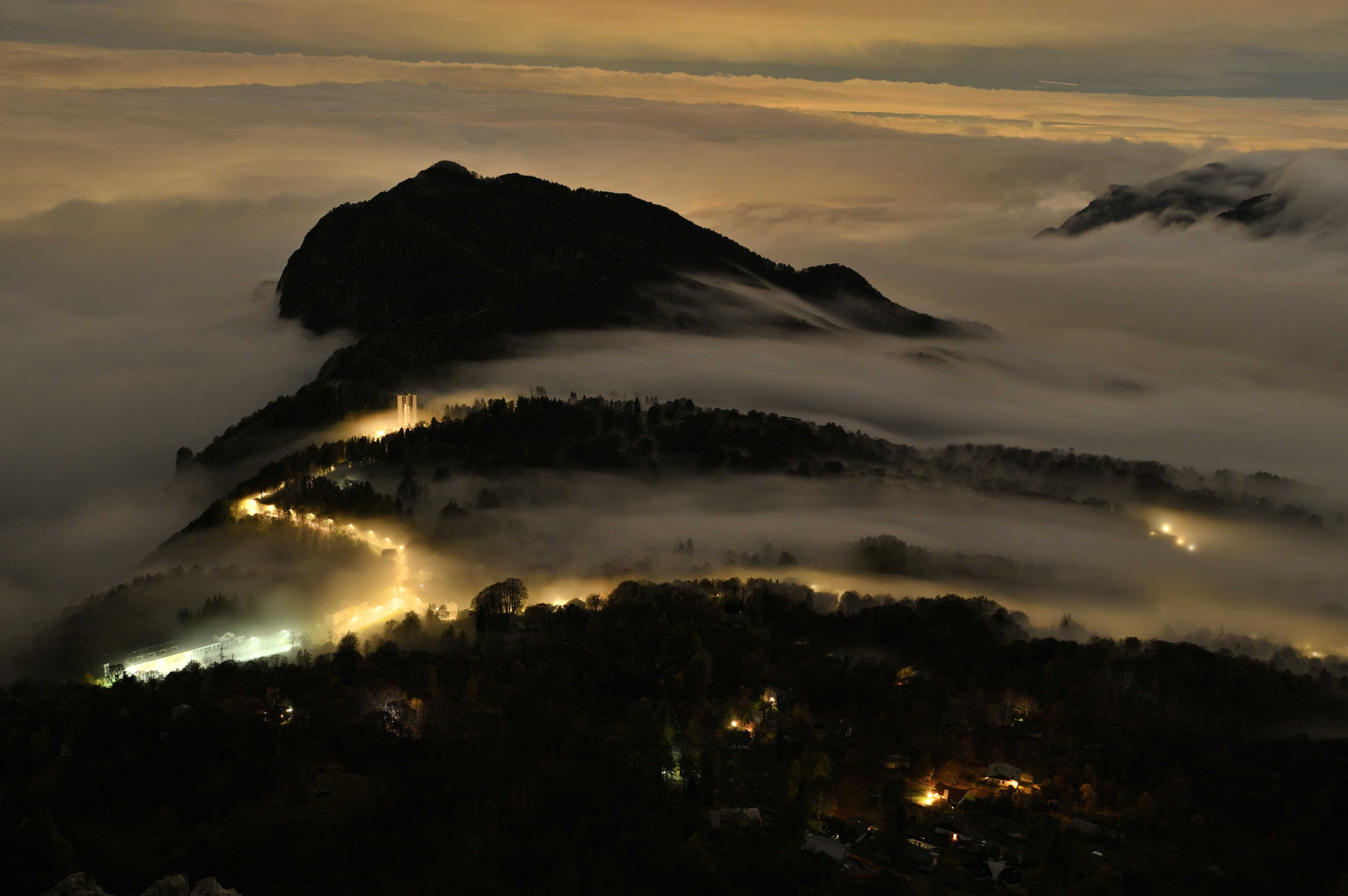 Finalmente, all’inizio della Cresta Cermenati, intravedo la luna ed esco in un ambiente incantato. Il Resegone, Il Due Mani e le cime più alte delle Orobie spuntano come fantasmi dalla compatta coltre di nubi. Giunto al traverso per i Magnaghi, un rapido sguardo verso il Coltignone, mi lascia attonito. La nebbia si sta diradando e lambisce i Resinelli lasciando intravedere l’illuminazione stradale. Raramente mi era capitato di assistere ad un evento così suggestivo. Rimando l’idea inizale dell’alba dalla vetta, per dedicarmi al nuovo attraente spunto fotografico.