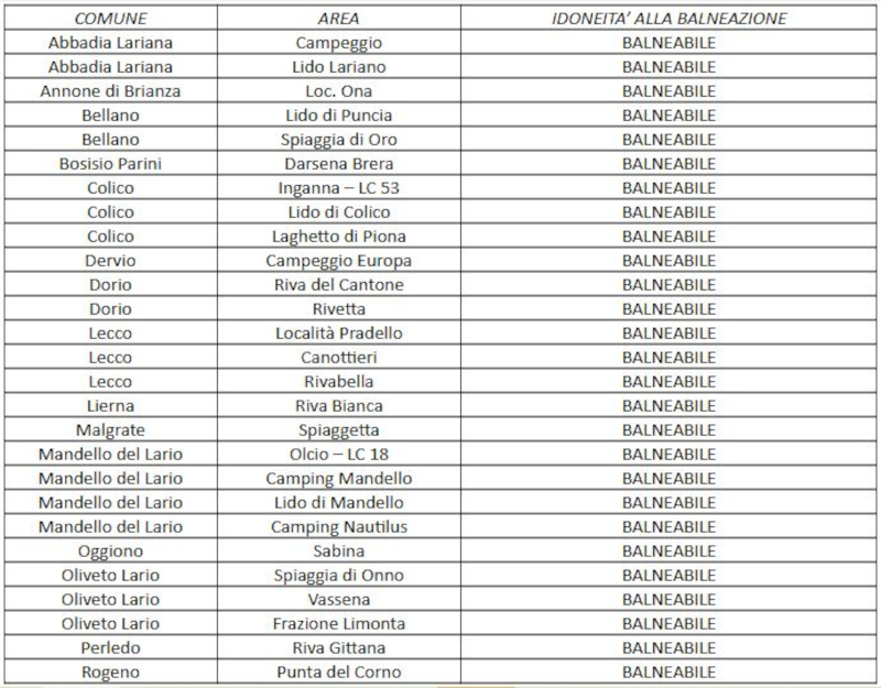 LECCO – In base agli esiti analitici dei campionamenti effettuati da Ats Brianza si esprimono i seguenti giudizi ai fini della balneazione: