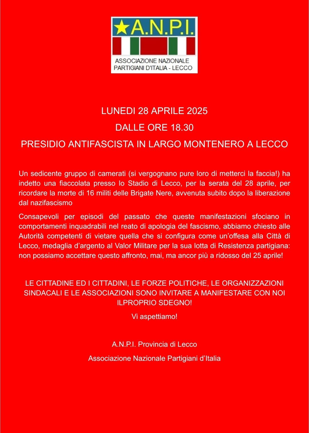 “Consapevoli per episodi del passato che queste manifestazioni sfociano in comportamenti inquadrabili nel reato di apologia del fascismo, abbiamo chiesto alle Autorità competenti di vietare quella che si configura come un’offesa alla Città di Lecco, medaglia d’argento al Valor Militare per la sua lotta di Resistenza partigiana: non possiamo accettare questo affronto, mai, ma ancor più a ridosso del 25 aprile! Cittadine e cittadini, forze politiche, organizzazioni sindacali e associazioni sono invitate a manifestare con noi il proprio sdegno”.