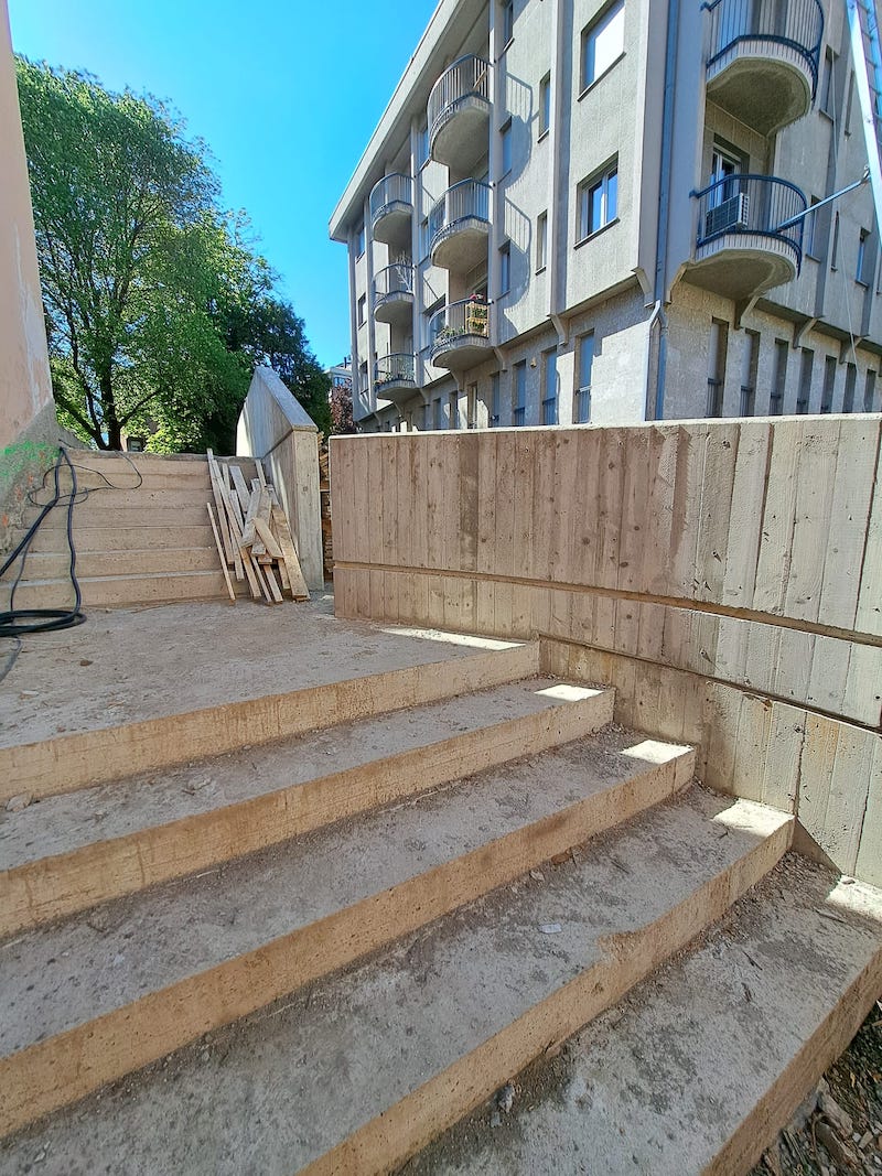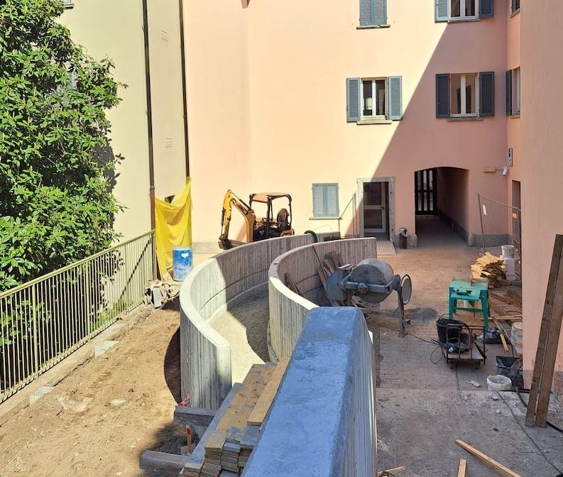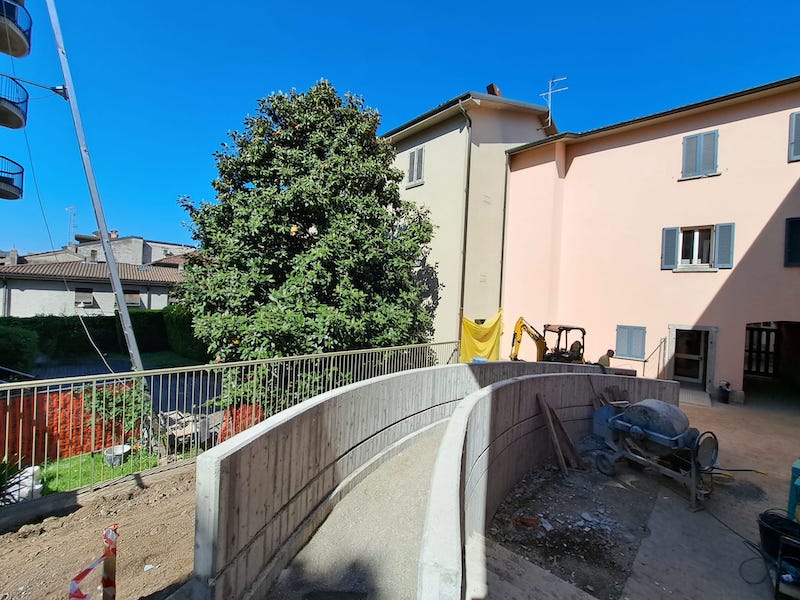 La scorsa settimana nella parte sud del giardino è stata realizzata la nuova scala, mantenendo la struttura della precedente e allargando le pedate, mentre è stata effettuata la gettata delle spalle della nuova rampa percorribile anche da persone con disabilità.