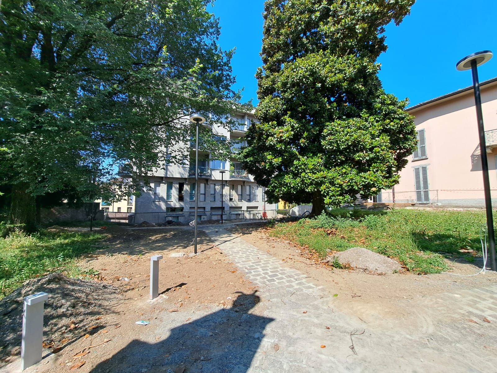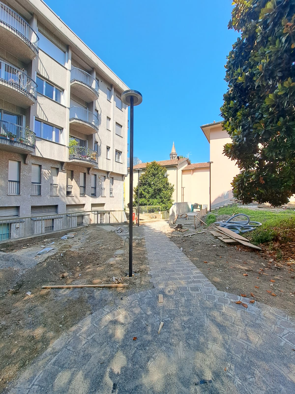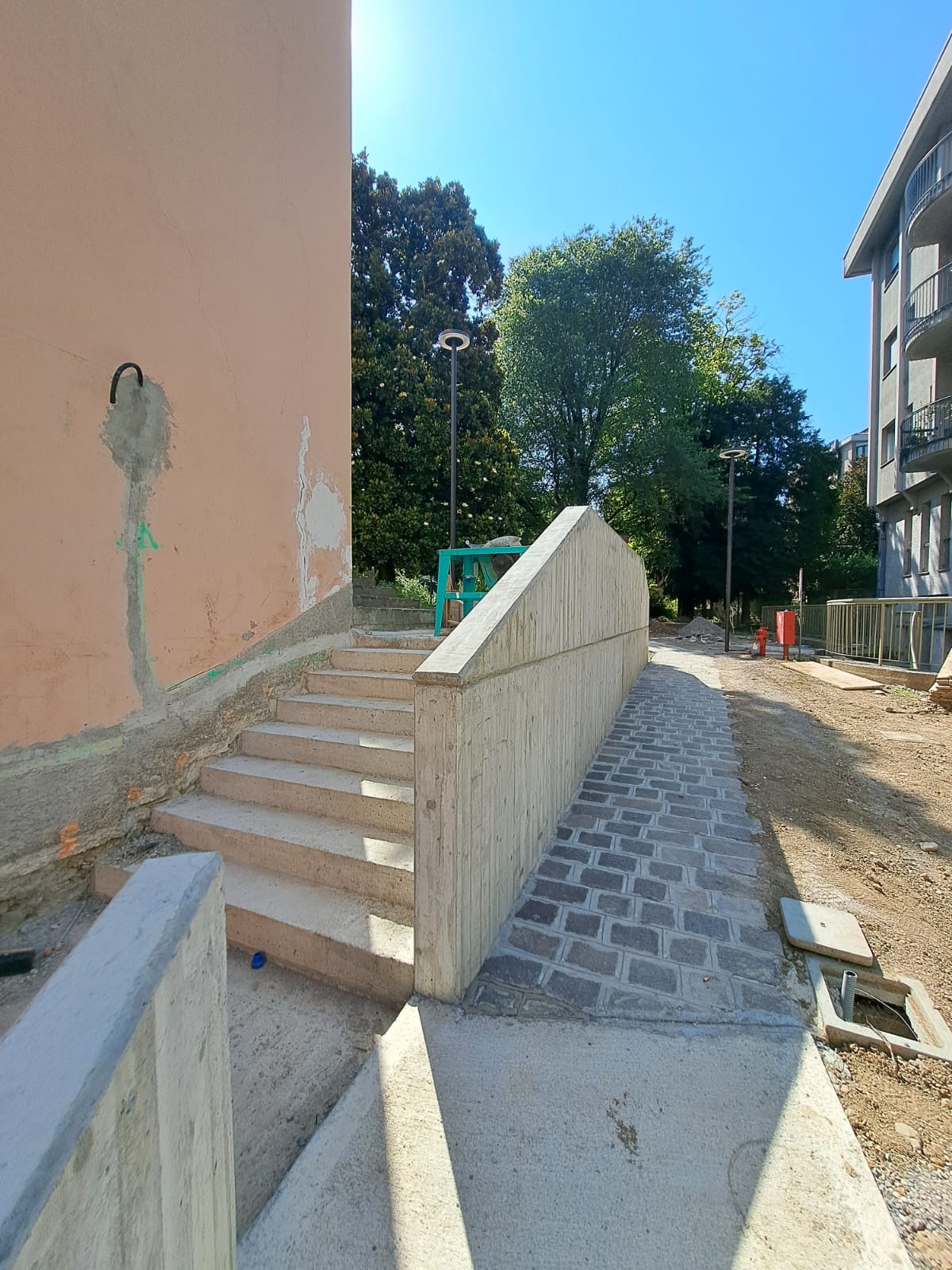 Il cuore dell’intervento – la realizzazione della nuova passerella curva, la modifica della scalinata esistente e la messa in quota dell’intero ingresso – è stato portato a termine nelle scorse settimane. Nella parte sud del giardino sono già stati tracciati i nuovi camminamenti, mentre i pali dell’illuminazione sono stati posati dopo la conclusione dell’impianto elettrico sottostante.