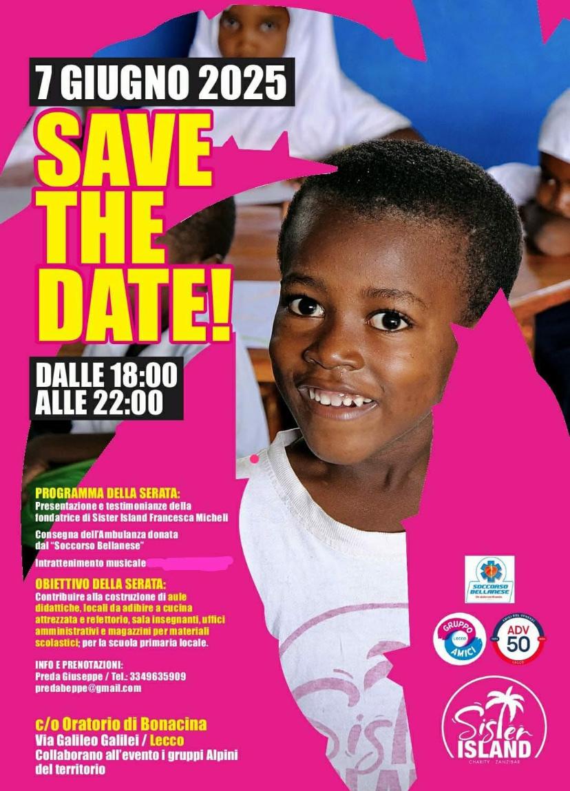 LECCO -All’oratorio di Bonacina la solidarietà si prepara a diventare protagonista di una serata speciale. Sabato 7 giugno, dalle 18:00 alle 22:00, i svolgerà un evento benefico a sostegno di Sister Island, progetto attivo in Tanzania. “Save the Date” questo il titolo della serata pensata per avvicinare la comunità locale a una causa concreta: il futuro scolastico dei bambini di un piccolo villaggio africano.