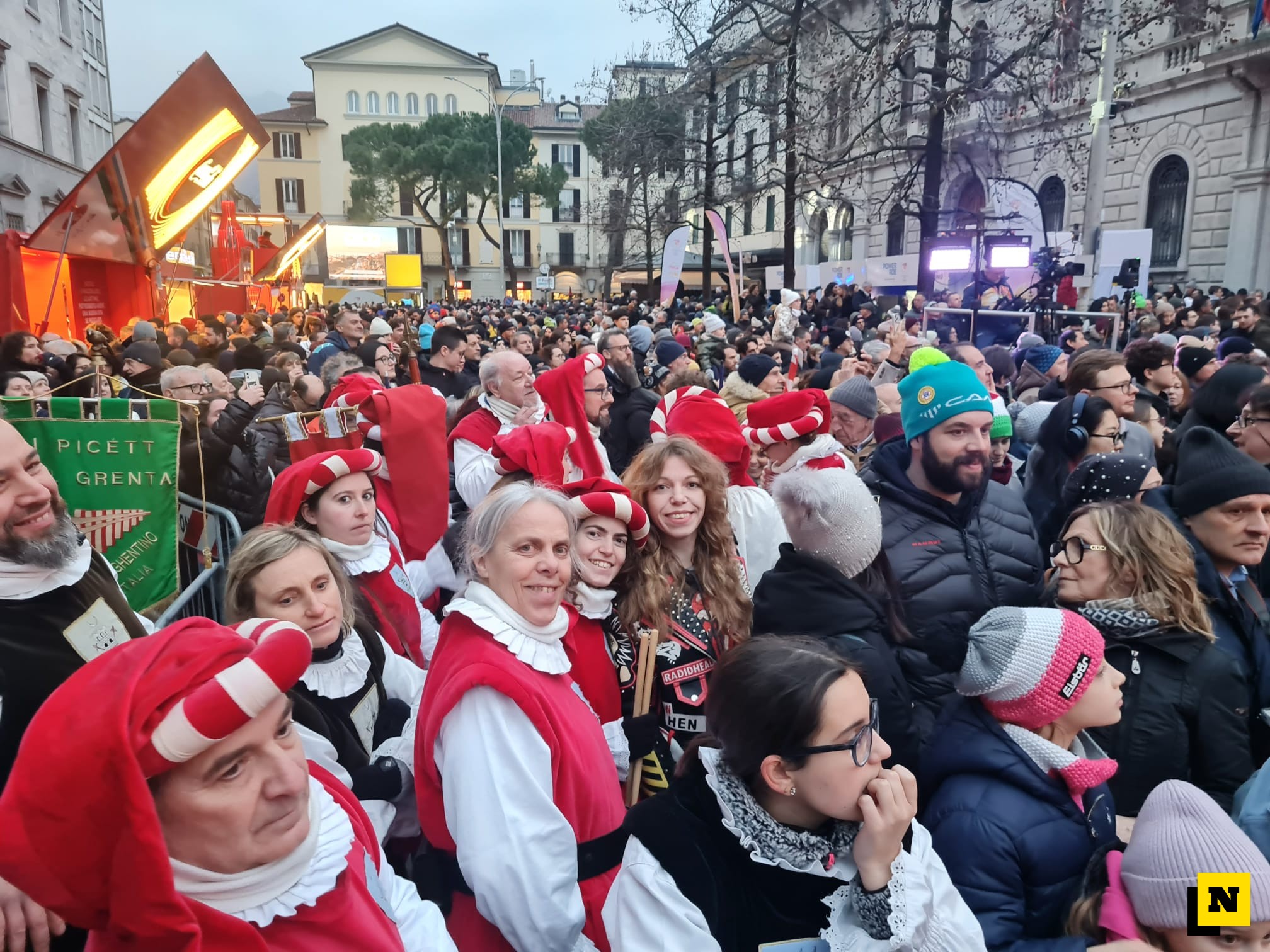 Un mare di persone stanno prendendo parte all’evento, aperto dallo spettacolo degli Sbandieratori di Primaluna a cui è seguito l’Inno d’Italia eseguito da I Picett del Grenta di Valgreghentino con i firlinfeu Renzo e Lucia di Acquate.