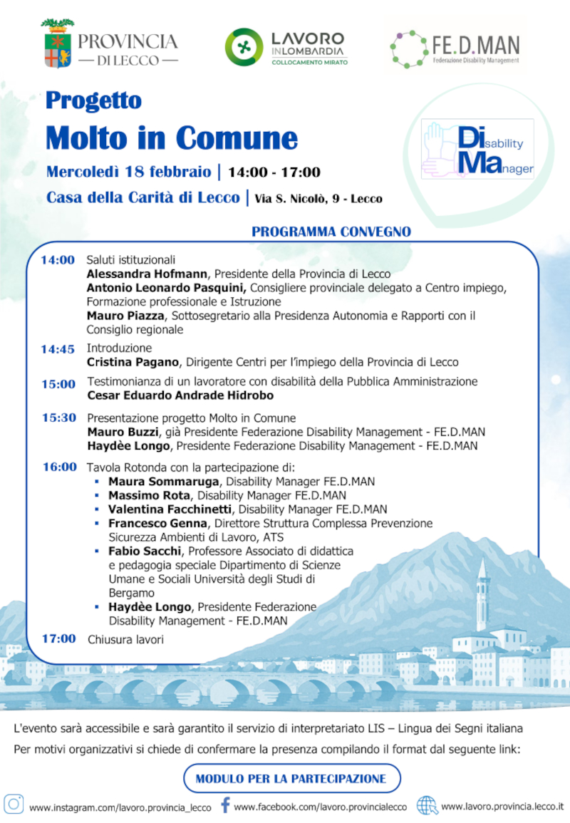 Il progetto della Provincia di Lecco, che ha concluso il suo primo anno di attività, è nato per dare supporto alle amministrazioni comunali e ai loro dipendenti, fornendo strumenti concreti per migliorare l’accessibilità organizzativa e gli strumenti di governo, per rendere più inclusiva l’esperienza lavorativa delle persone con disabilità all’interno degli enti di appartenenza.