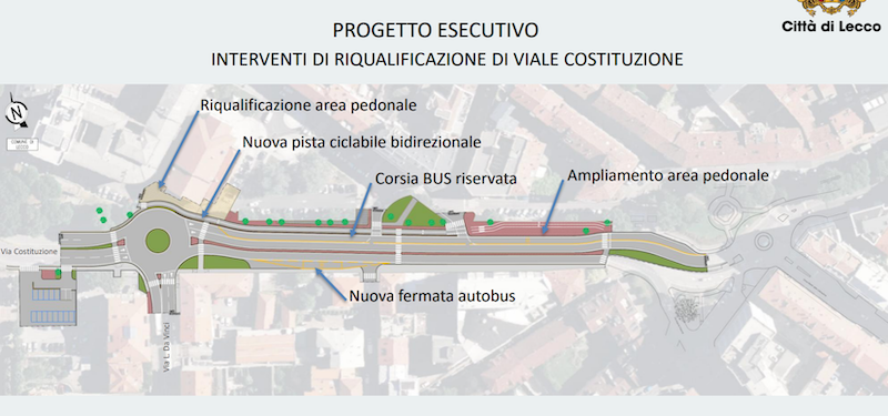 Come già anticipato nei mesi scorsi (leggi qui) nuovo intervento non riguarderà solo la rotatoria ma si estenderà anche al tratto da piazza Manzoni fino a viale Costituzione. Il progetto, condiviso con Linee Lecco, prevede una corsia riservata ai bus lungo viale Costituzione (in direzione via Leonardo da Vinci) per evitare che i mezzi del trasporto pubblico restino ‘incolonnati’ con le auto e viceversa. Nell’altro senso di marcia – dalla rotonda verso Piazza Manzoni – verrà mantenuta una sola corsia, con la fermata dei bus che sarà arretrata di qualche metro rispetto all’attuale posizione davanti ai vecchi cinema.