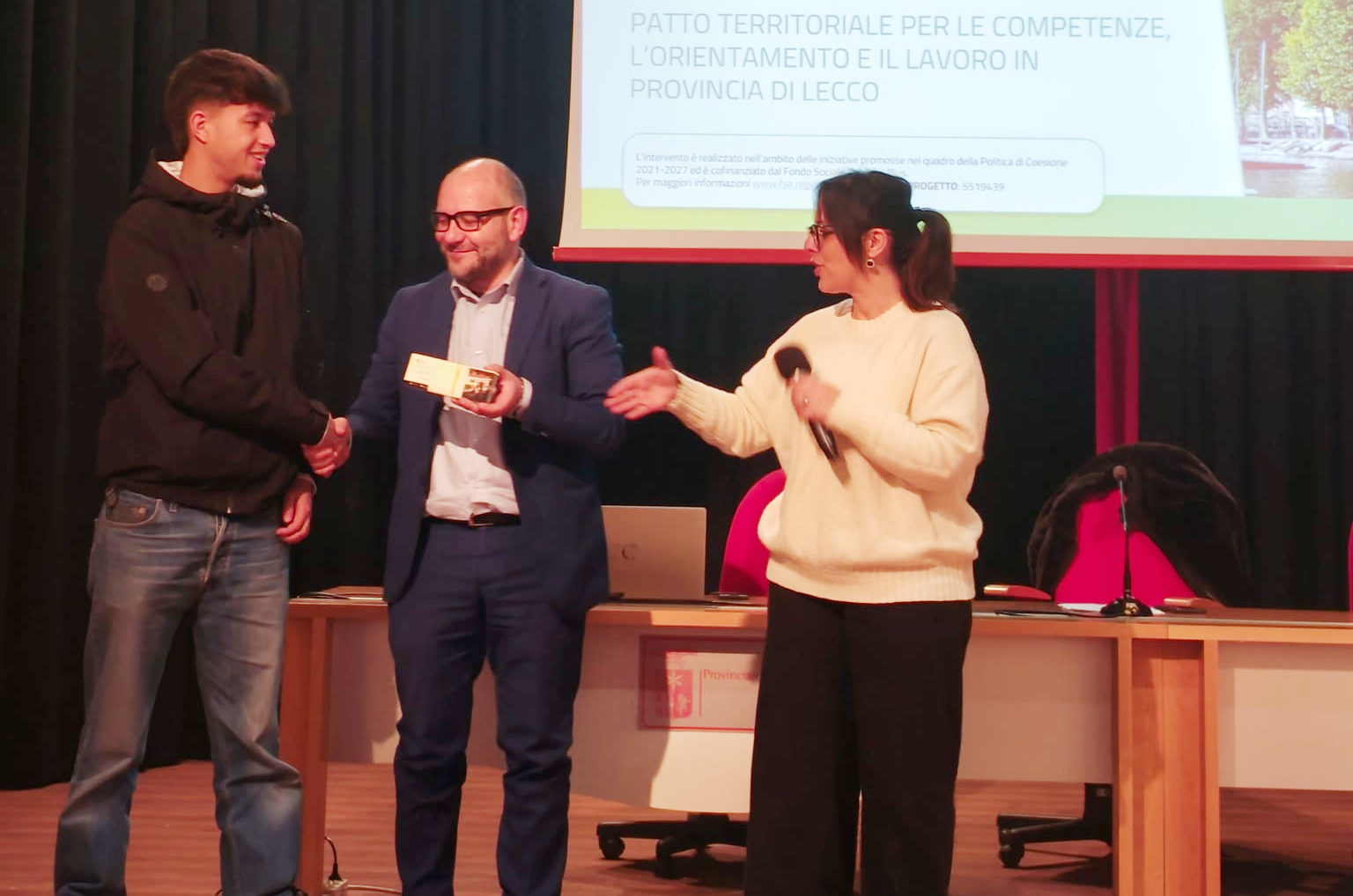 LECCO – Lunedì 10 febbraio, in sala don Ticozzi, si è svolta la premiazione del logo valutato come più rappresentativo del Patto territoriale per le competenze, l’orientamento e il lavoro in provincia di Lecco, alla presenza della Presidente della Provincia di Lecco Alessandra Hofmann, del Consigliere provinciale delegato a Centri impiego, Formazione professionale, Istruzione Antonio Leonardo Pasquini e del rappresentante dell’Ufficio scolastico territoriale Raffaele Cesana.