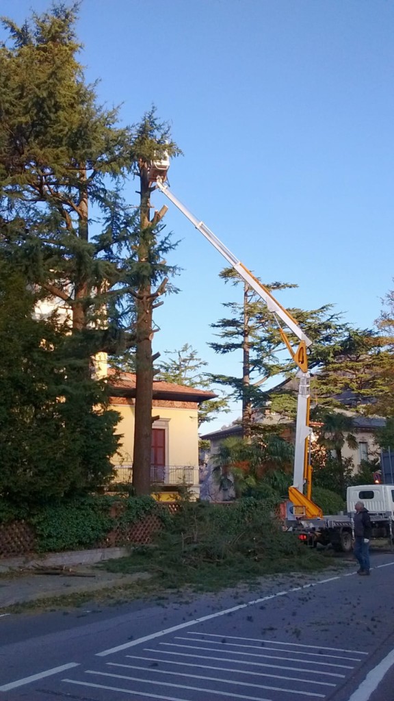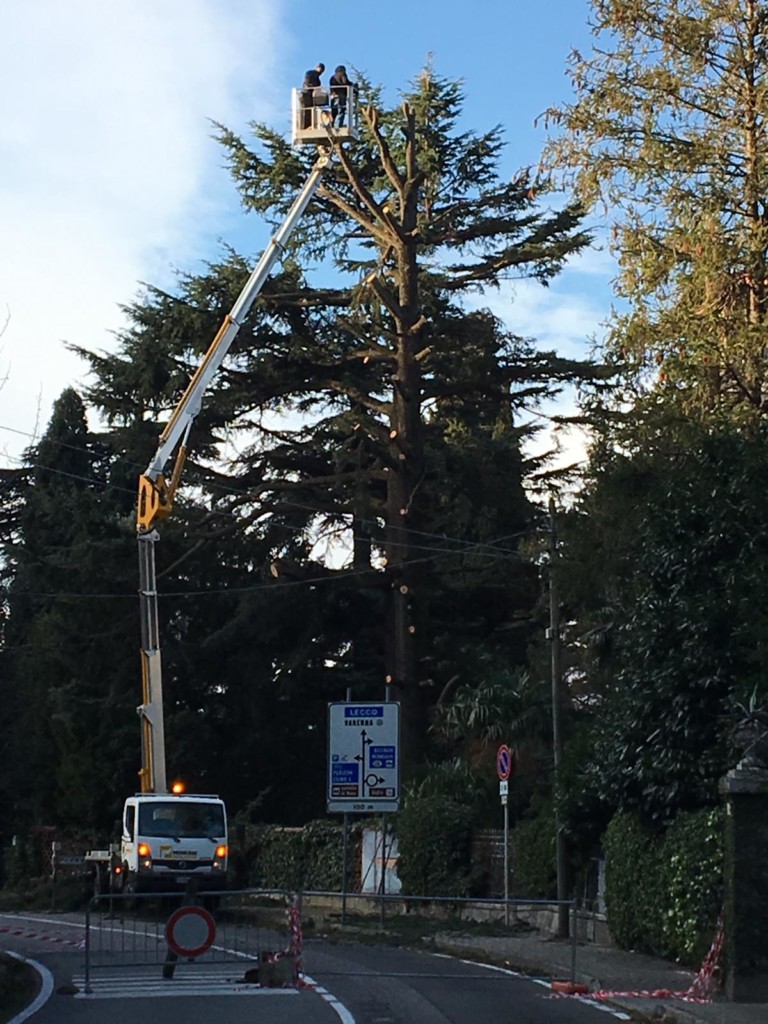 PERLEDO – Sono proseguiti venerdì mattina gli interventi di sfoltimento e taglio del pino pericolante sul viale dei Giardini, tra Perledo e Varenna.