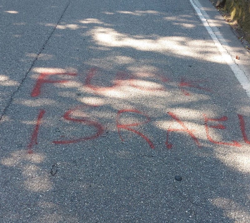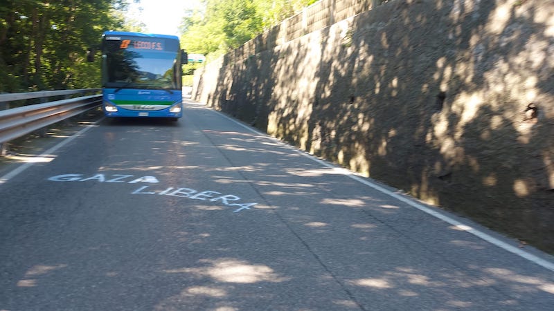 PESCATE – Scritte pro Gaza sono comparse nella notte lungo la Sp60 che da Pescate sale verso Galbiate. La Provinciale sarà percorsa oggi dai corridori del Giro d’Italia che attraverseranno il territorio nel corso della 18^ Tappa da Morbegno e Cesano Maderno e la comparsa delle scritte ha indignato il sindaco di Pescate Dante De Capitani che si è attivato per farle rimuovere entro la mattinata.