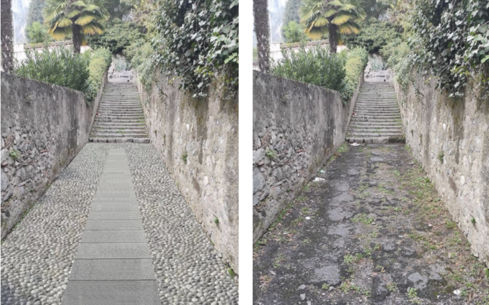 Rione di Rancio: a destra lo stato attuale dell'area, a sinistra il progetto di riqualificazione.