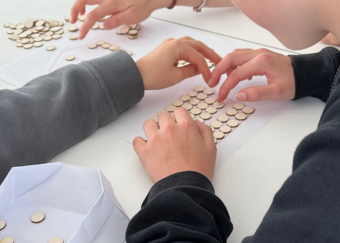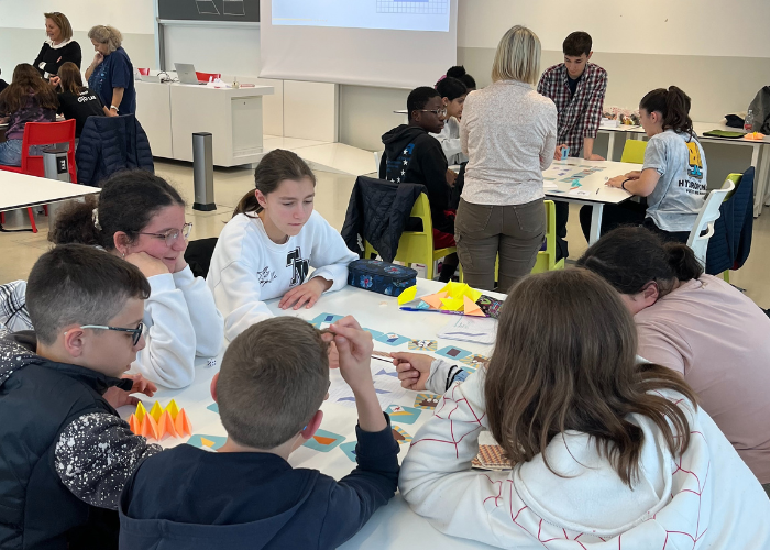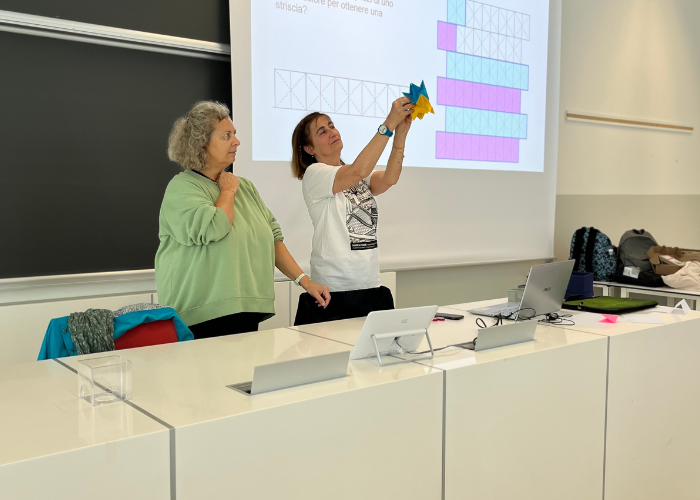La struttura del laboratorio ha previsto tre attività pratiche svolte in piccoli gruppi, durante le quali gli studenti hanno costruito manufatti da riportare nelle classi. La prima attività consisteva nell’introduzione all’uso del design, dell’origami e della matematica per risolvere problemi tecnologici, con la realizzazione di un prototipo di stent cardiaco in carta. La seconda attività si è concentrata sulla matematica delle api, affrontando la tassellazione del piano e alcuni problemi isoperimetrici. Infine, la terza attività ha coinvolto gli studenti in un gioco a squadre che ha permesso di esplorare i concetti geometrici in modo interattivo e coinvolgente e, allo stesso tempo, di coltivare abilità cognitive essenziali. Attraverso il pensiero strategico e il ragionamento spaziale, i giocatori hanno imparato a destrutturare geometrie complesse, affinando la loro capacità di visualizzare e comprendere le relazioni geometriche fondamentali.