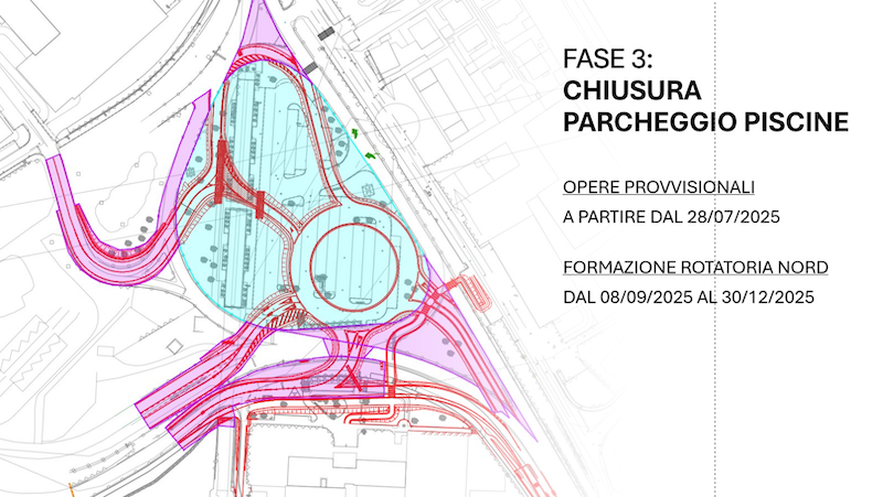 La Fase 3 sarà la più impegnativa: “A partire dal 27 luglio il parcheggio di fronte al centro sportivo, quello utilizzato oggi dagli utenti, verrà chiuso. Qui infatti verrà realizzata la maxi rotonda che costituirà il principale svincolo della nuova viabilità. I lavori per la rotatoria dureranno da settembre a fine anno: l’obiettivo infatti è quello di terminare e rendere funzionale la rotonda contestualmente all’apertura del Quarto Ponte, i cui lavori saranno completati entro il 31 dicembre 2025”. Intorno alla rotatoria verranno poi realizzate le opere viabilistiche di raccordo con i due ponti (le parti in viola nell’immagine, ndr), tra cui anche le bretelle per l’ipotetica (e attesa) seconda corsia del nuovo manufatto in costruzione sull’Adda.