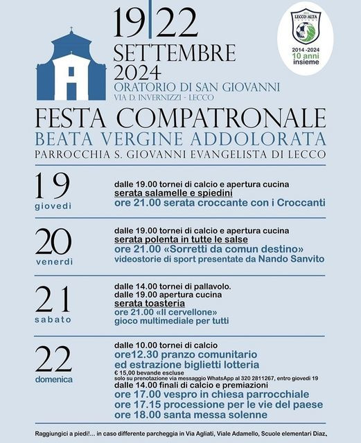 Subito dopo, dal 19 al 22 settembre, il rione di San Giovanni ospiterà la Festa Compatronale della Beata Vergine Addolorata, un evento che unisce fede, tradizione e divertimento. Le celebrazioni si apriranno giovedì 19 settembre con tornei di calcio e una serata gastronomica a base di salamelle e spiedini. La serata proseguirà con uno spettacolo musicale dei “Croccanti”. Venerdì 20, dopo la consueta apertura della cucina, sarà la volta di una serata dedicata alla polenta in tutte le sue declinazioni, seguita dalla proiezione del video “Sorretti da comun destino”, presentato da Nando Sanvito.