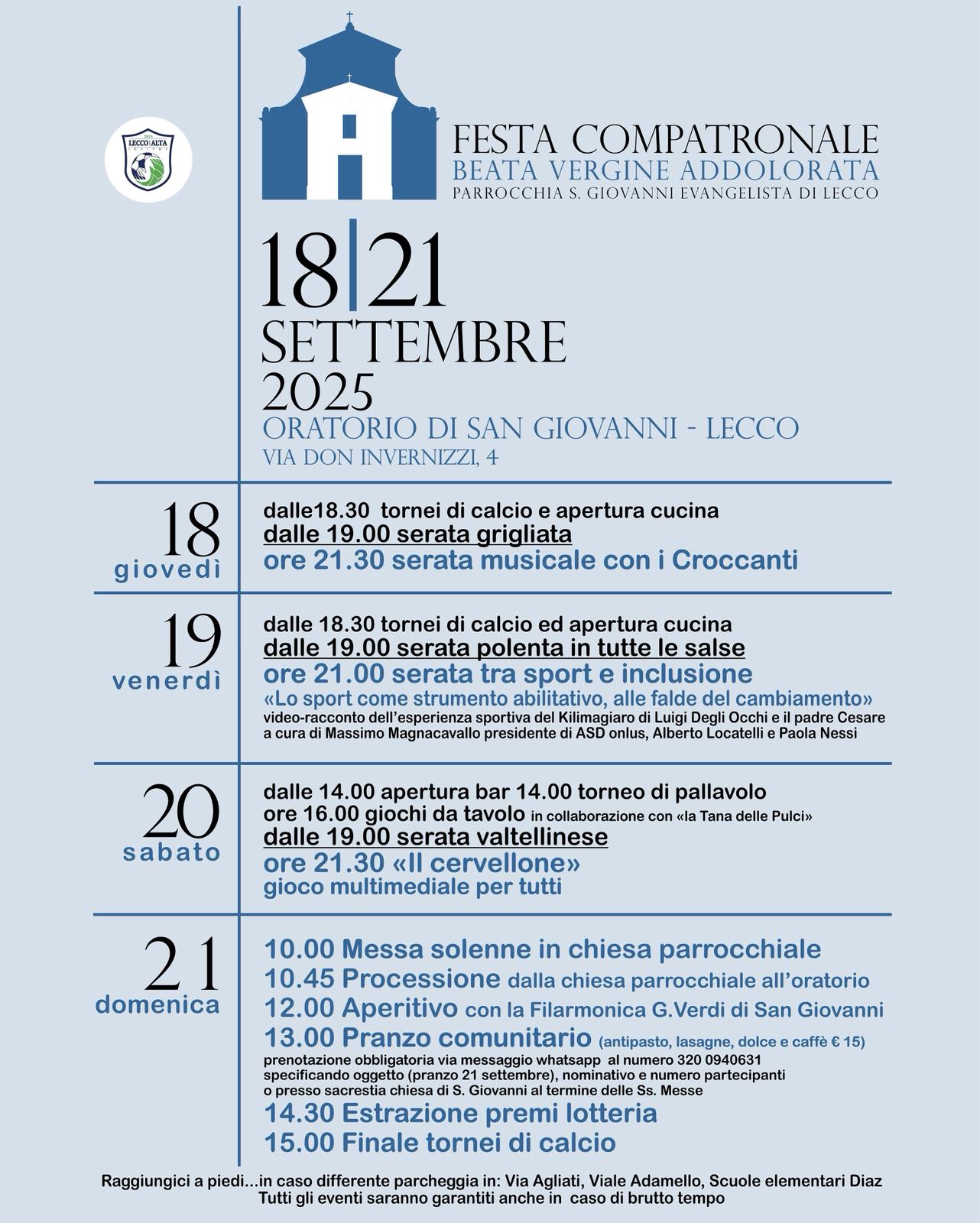 LECCO – E’ in programma dal 18 al 21 settembre prossimo la festa compatronale della Beata Vergine Addolorata della parrocchia di San Giovanni Evangelista di Lecco. Sport, musica, incontri e buona cucina si alterneranno a momenti solenni che culmineranno nella messa solenne di domenica 21 settembre alle 10 che precederà la processione.