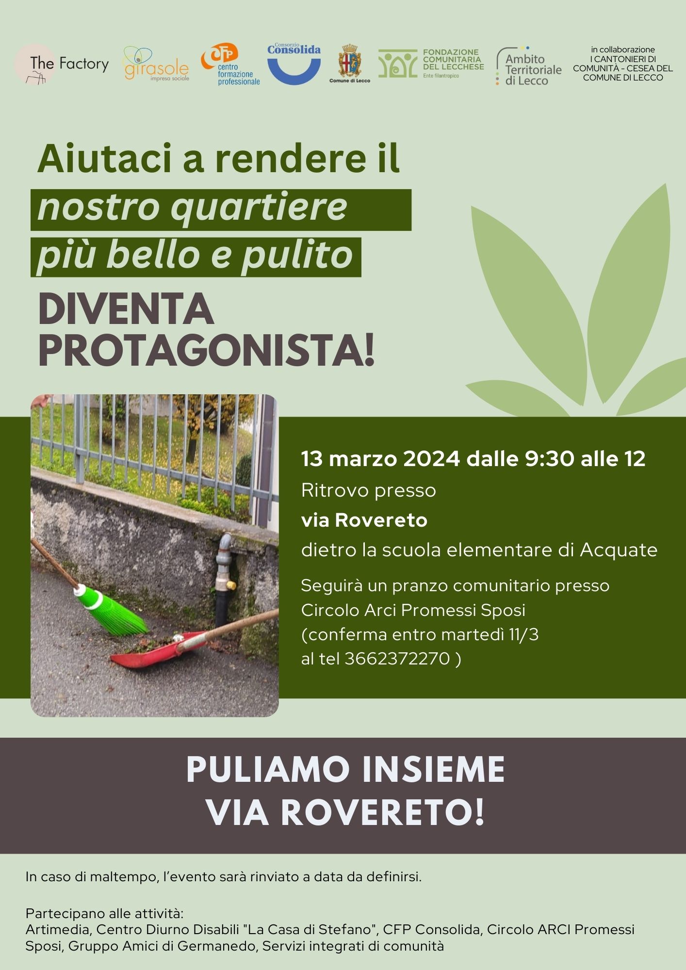 L’invito è esteso a tutta la cittadinanza. Il ritrovo è previsto dietro la scuola elementare di Acquate. Al termine dell’iniziativa, chi lo desidera potrà partecipare a un pranzo comunitario presso il Circolo ARCI Promessi Sposi. Per confermare la partecipazione al pranzo, è richiesta la prenotazione entro martedì 11 marzo al numero 366 2372270. In caso di maltempo l’iniziativa sarà rinviata a data da definirsi nelle prossime settimane.