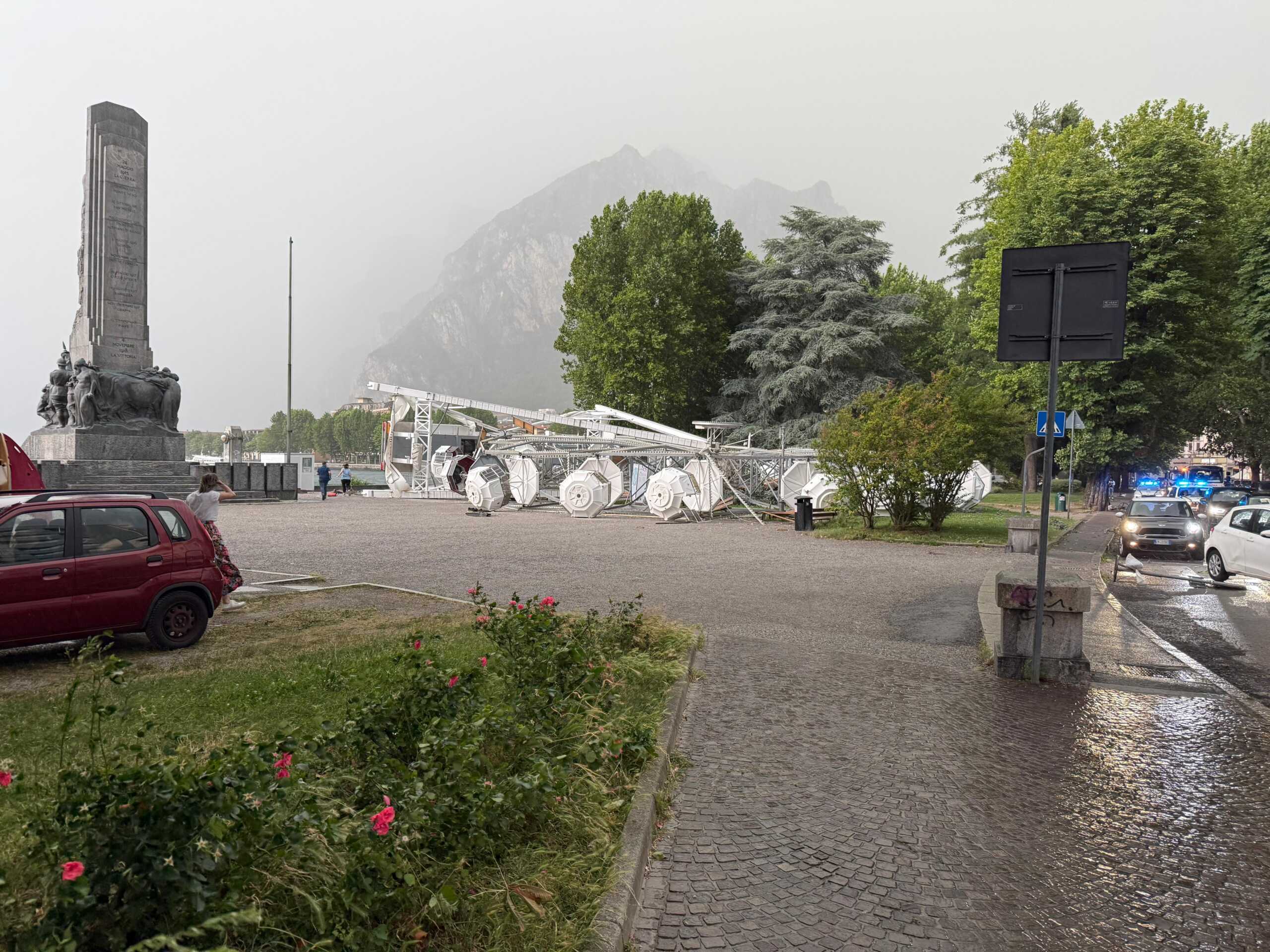 A sconvolgere soprattutto il crollo della ruota panoramica, situata sul lungolago vicino al Monumento ai Caduti, ormai a tutti gli effetti un simbolo del capoluogo. Fortunatamente nessuno si è fatto male “grazie alla prontezza del gestore – fa sapere il primo cittadino – accortosi del vento più forte del consueto, ha fatto scendere tutti coloro che si trovavano a bordo”.