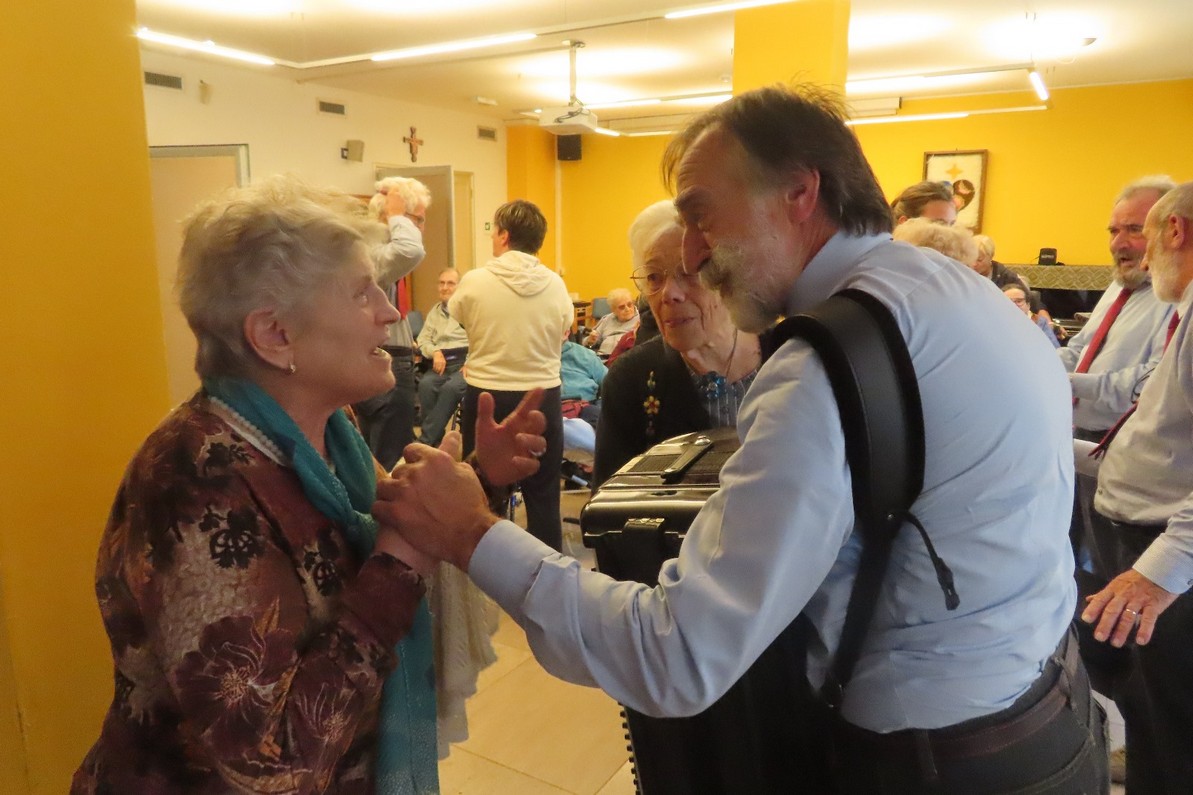 Durante l’intervallo, Gabriele ha presentato Angelo Fontana, uno dei tanti volontari di Telethon, spiegando agli ospiti l’importanza della ricerca che la Fondazione porta avanti anche sul territorio lecchese. Come sempre, Gabriele ha chiesto agli ospiti quali canzoni desiderassero ascoltare e, soprattutto, cantare insieme. Tutti i brani hanno suscitato emozioni, ma il momento più toccante è arrivato con “Mamma”: un canto che, interpretato con la sua fisarmonica e accompagnato dal gesto di inginocchiarsi davanti a un’ospite, ha regalato a tutti la pelle d’oca.