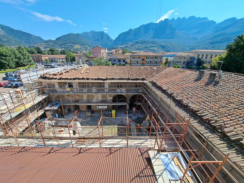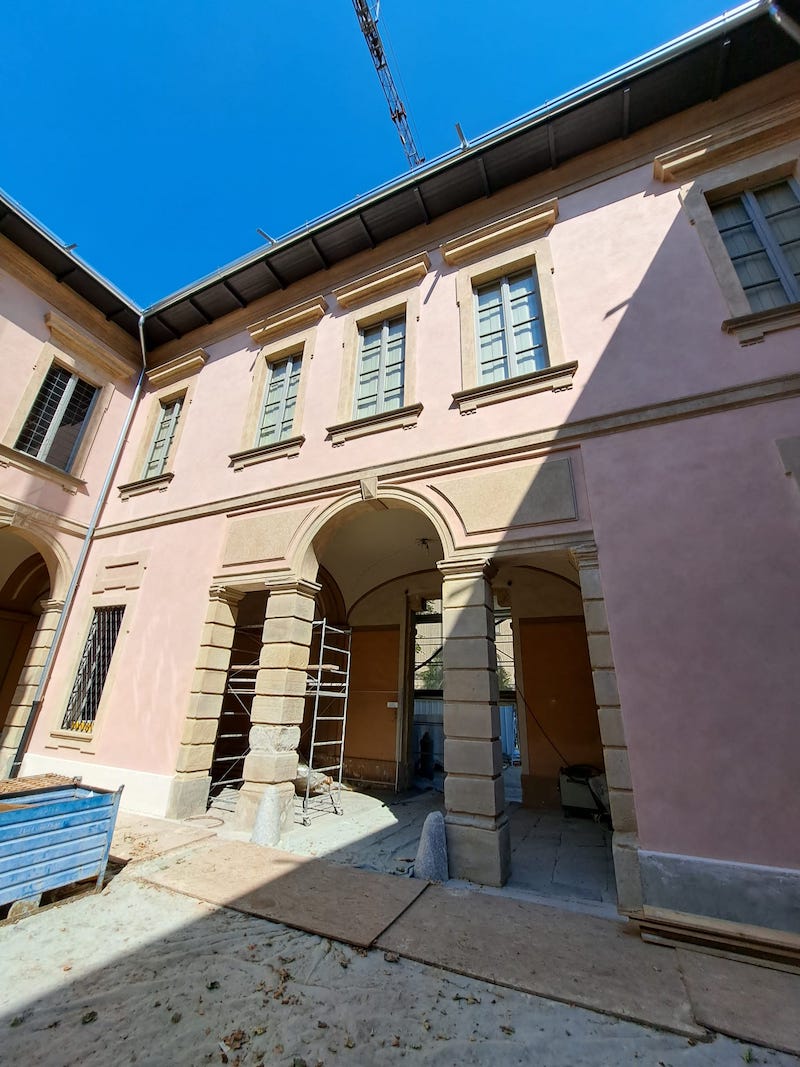 LECCO – Sopralluogo nella mattinata di venerdì per il sindaco Mauro Gattinoni a Villa Manzoni, dove è in corso un importante intervento di riqualificazione e restauro che restituirà alla città uno dei suoi poli culturali più belli e significativi. I lavori, iniziati lo scorso anno, procedono a ritmo serrato e hanno già trasformato il volto del cortile interno, che ora sfoggia un elegante colore rosa, abbandonando il precedente giallo.