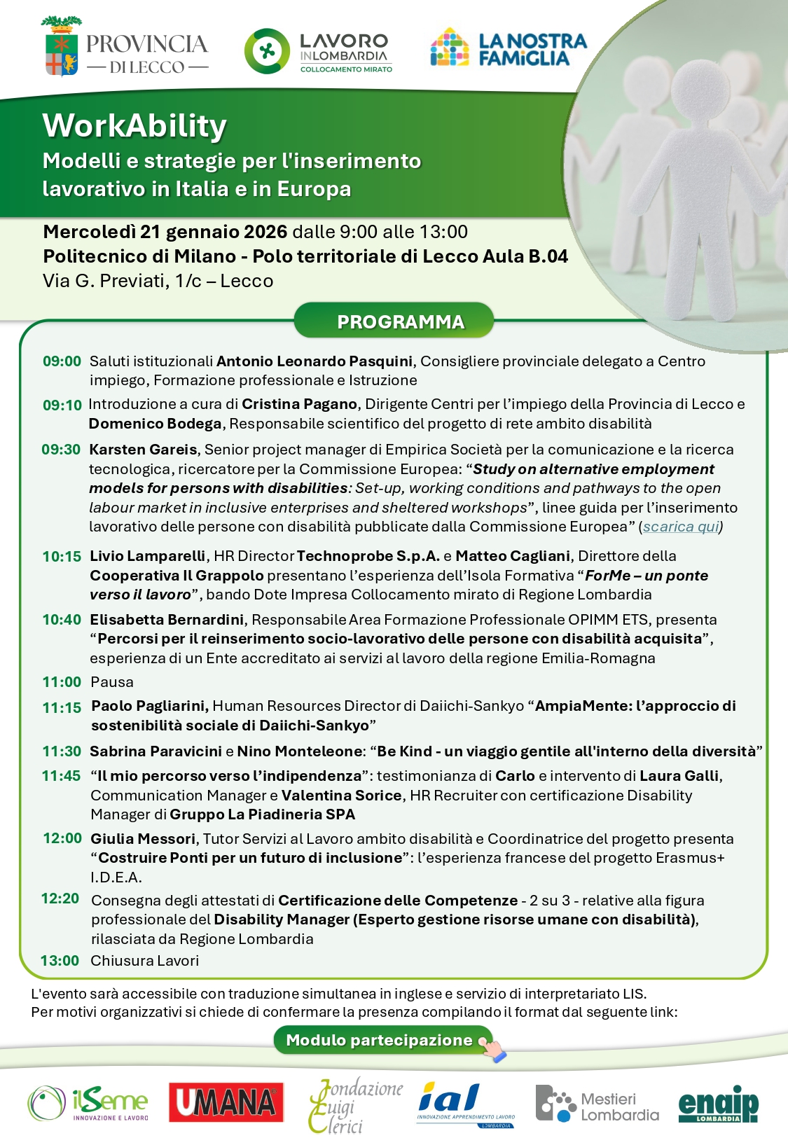 LECCO – Il Politecnico di Milano – Polo territoriale di Lecco ospiterà, mercoledì 21 gennaio dalle 9.00 alle 13.00, il convegno WorkAbility – Modelli e strategie per l’inserimento lavorativo in Italia e inEuropa, evento conclusivo del progetto di rete nell’ambito della disabilità, coordinato dal Collocamento mirato della Provincia di Lecco e realizzato dagli enti accreditati al lavoro per la disabilità.