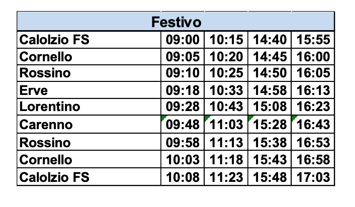 Durante tutta la stagione invernale sarà possibile richiedere l’attivazione fino a quattro corse lungo la direttrice Calolzio – Erve – Carenno, due al mattino e due al pomeriggio, come nella tabella riportata: