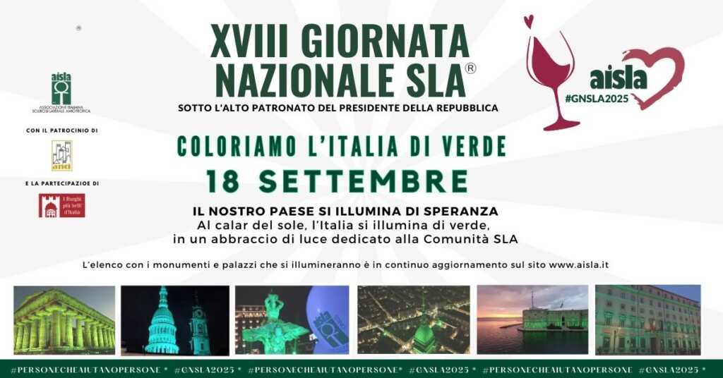 “Coloriamo l’Italia di verde” è nata quasi per gioco dall’idea di alcuni volontari ed è diventata, anno dopo anno, un appuntamento atteso e condiviso. Il colore verde, scelto non solo per rappresentare la speranza e la vitalità ma anche come colore ufficiale di AISLA, trasformerà per una notte piazze e monumenti in un messaggio visibile di solidarietà e vicinanza.