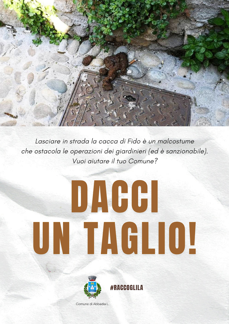 “Dacci un taglio!” è lo slogan scelto dall’Amministrazione comunale di Abbadia e ha una duplice valenza: intimare lo stop a comportamenti scorretti, e allo stesso tempo far capire che se si vuole mantenere il paese in ordine esiste soltanto una strada, raccogliere le deiezioni dei propri amici a quattro zampe.