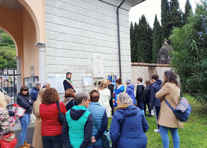 I partecipanti, tra cui una decina di studentesse e studenti della scuola secondaria di primo grado accompagnati dai loro insegnanti (sebbene inizialmente avessero aderito in molti di più, poi dissuasi dal tempo incerto), hanno percorso a piedi il tragitto dal Cimitero alla Sala Civica, passando per la Maiola, dove sono collocate alcune lapidi commemorative.