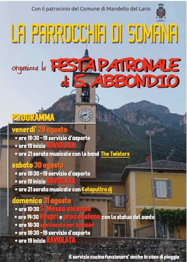 MANDELLO – La comunità di Somana si prepara a vivere uno degli appuntamenti più sentiti dell’anno: la Festa Patronale di Sant’Abbondio. L’iniziativa, organizzata dalla parrocchia con il patrocinio del Comune di Mandello del Lario, proporrà tre giornate di celebrazioni religiose, momenti di socialità e intrattenimento.