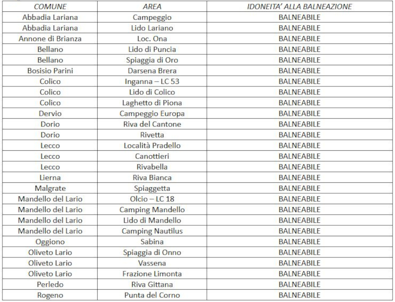 LECCO – In base agli esiti analitici dei campionamenti effettuati si esprimono i seguenti giudizi ai fini della balneazione: